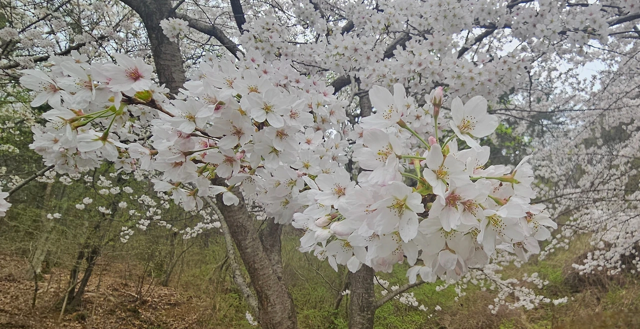 남해 설천 왕지 벚꽃길입니다. 벚꽃이 만개해서 머리 위에서 환하게 웃고 있었어요. 동글동글 하얀 작은 공처럼 뭉쳐진 꽃송이들이 수백만 개 달려 있었어요.