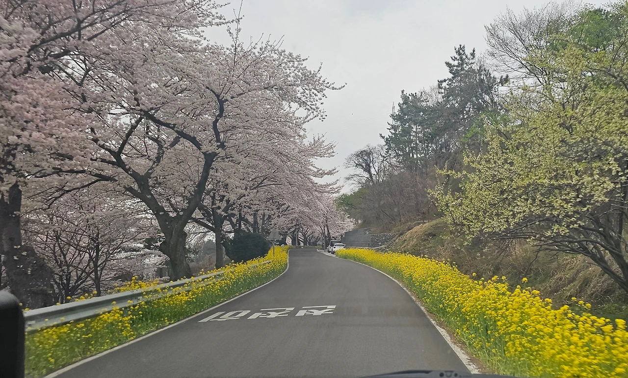 이곳은 다랭이논 같은 작은 논과 길가에 유채를 심어 놓았네요. 노란 유채와 하얀 벚꽃이 잘 어울려요.