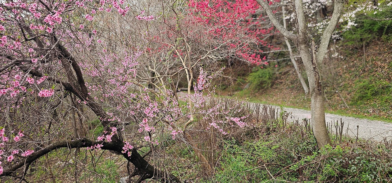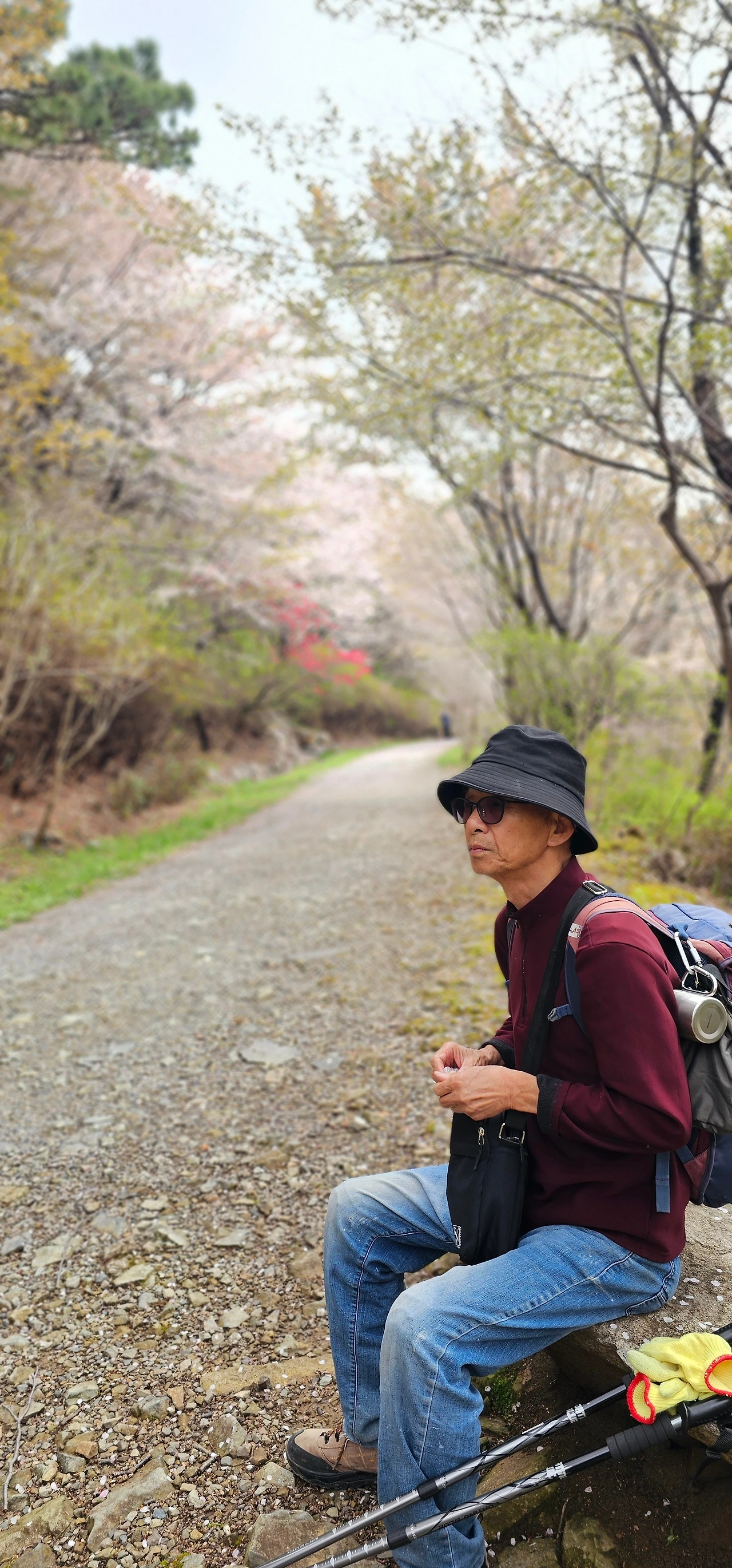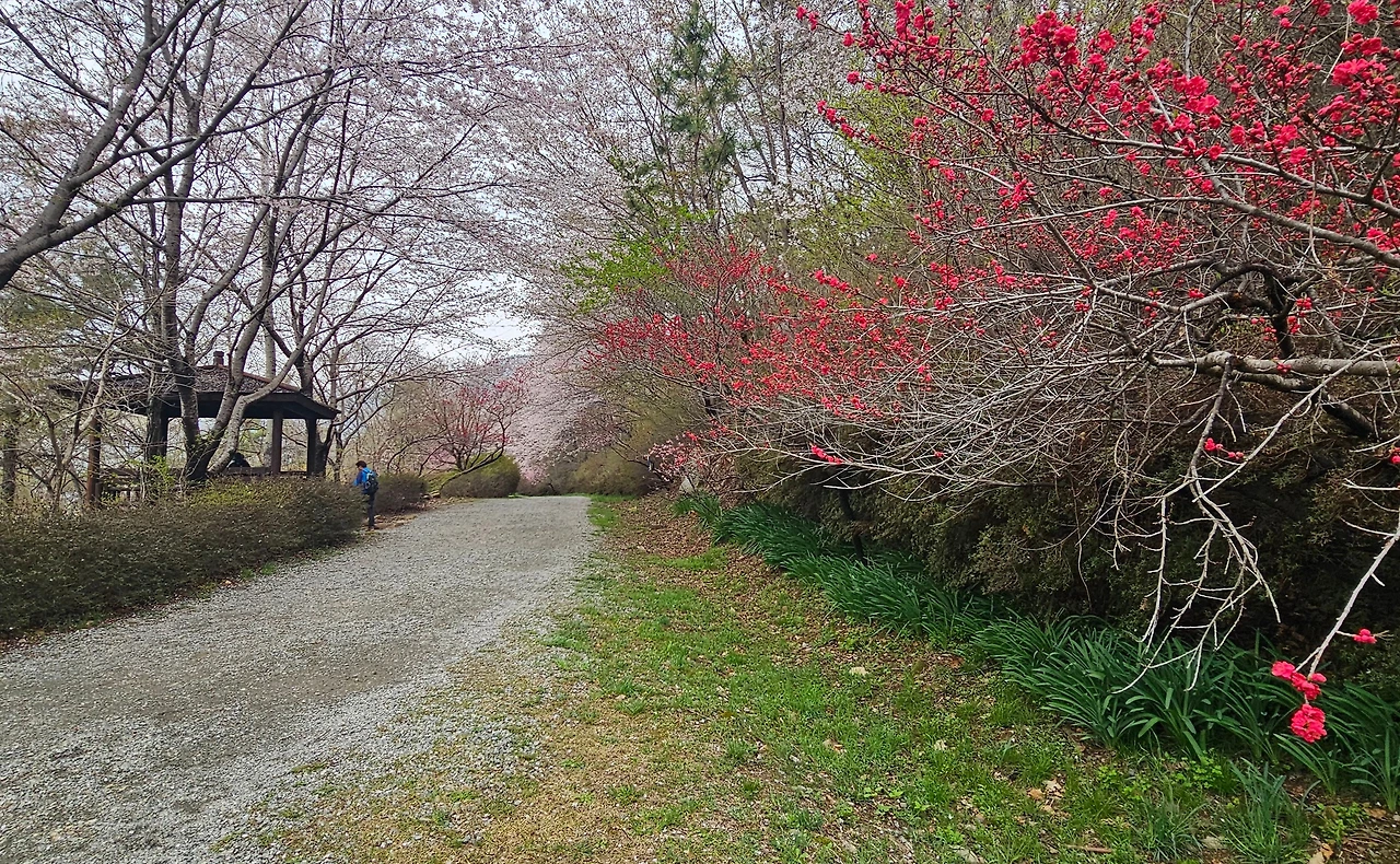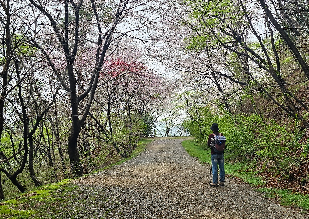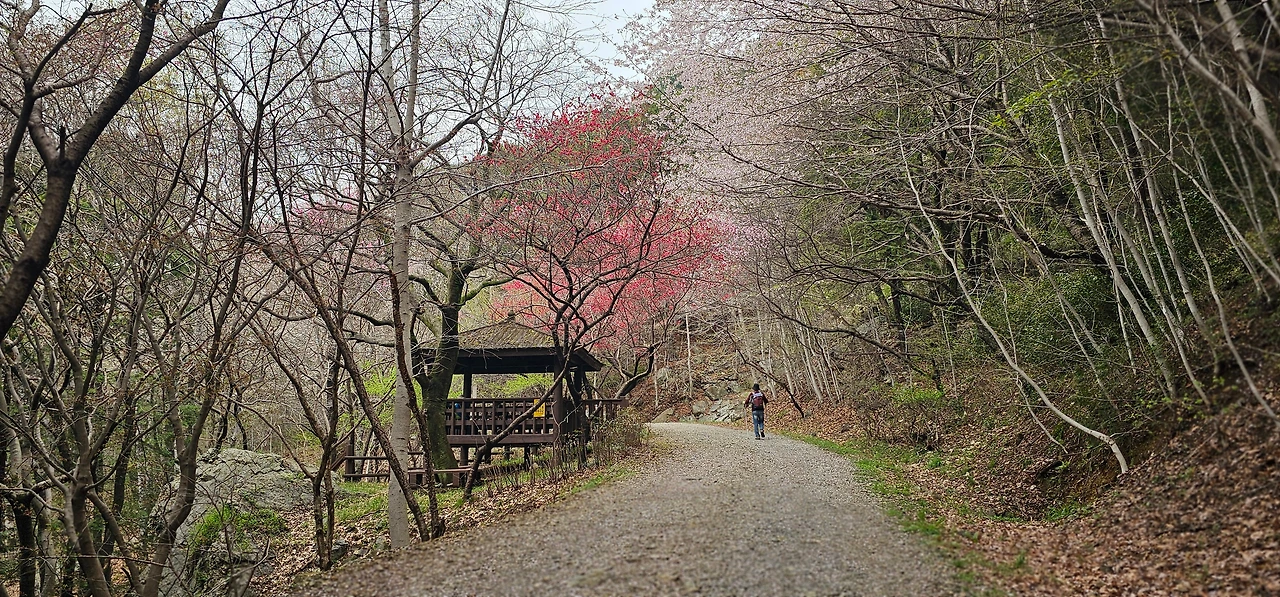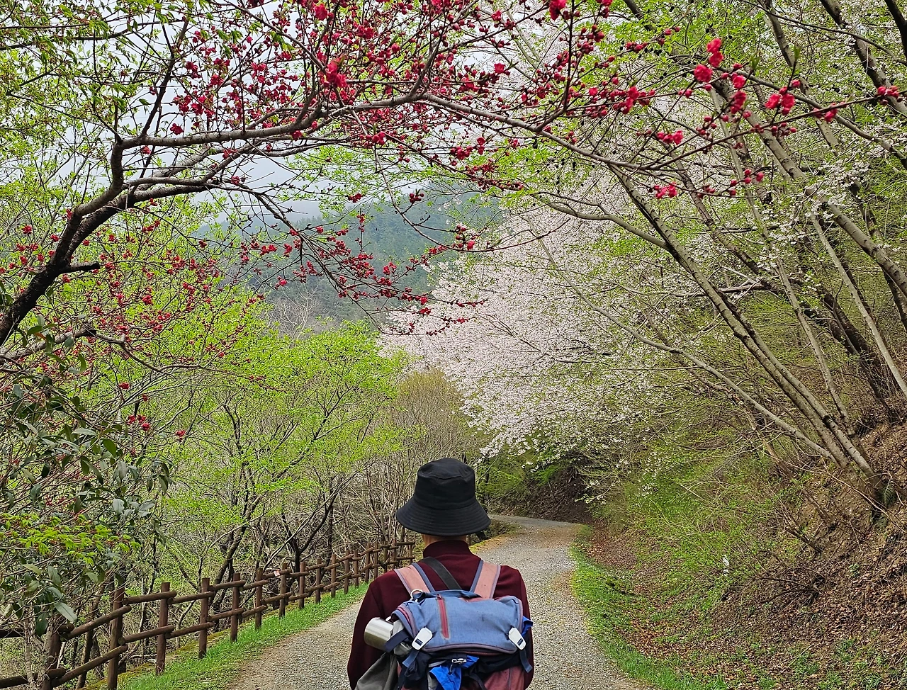 그 후 대발령에서 편백 치유의 숲까지 걸어보았습니다. 이 길은 평이하면서 조망도 있고 홍도화와 복사꽃 벚꽃의 꽃 대궐을 볼 수 있는 코스입니다. 시내버스 타는 곳까지 걸으면 20km쯤 되리라 생각합니다.