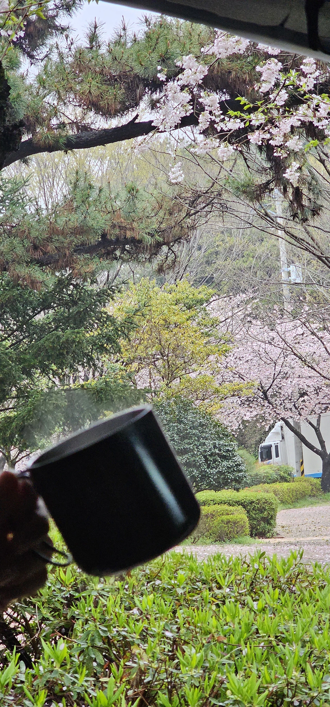 벚꽃 핀 차박지에서 커피 한 잔이 고마울 뿐입니다.