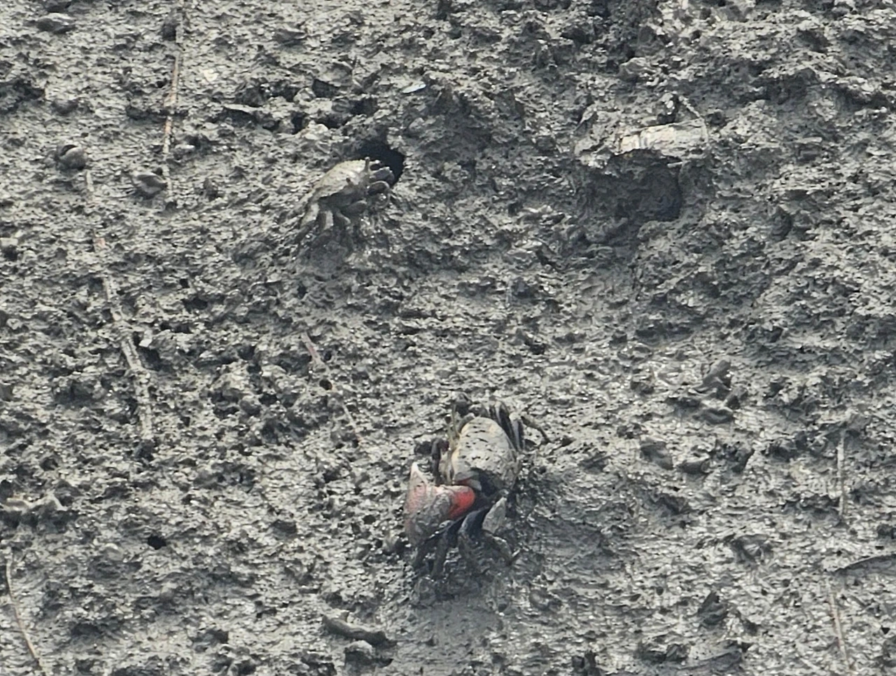 오후 3시 갯벌에는 많은 게 들과 짱뚱어들이 부지런히 움직입니다. 노는 것인지 먹이활동을 하는 것인지 내 눈에는 평화롭고 활기찬 풍경입니다. 빨간 집게를 가진 게 들이 눈에 뜨입니다. 잘 놀다가 우리가 지나가니 얼음 땡 놀이의 얼음모드로 변합니다. 갯벌 속에 얼굴만 파묻고 얼음입니다.