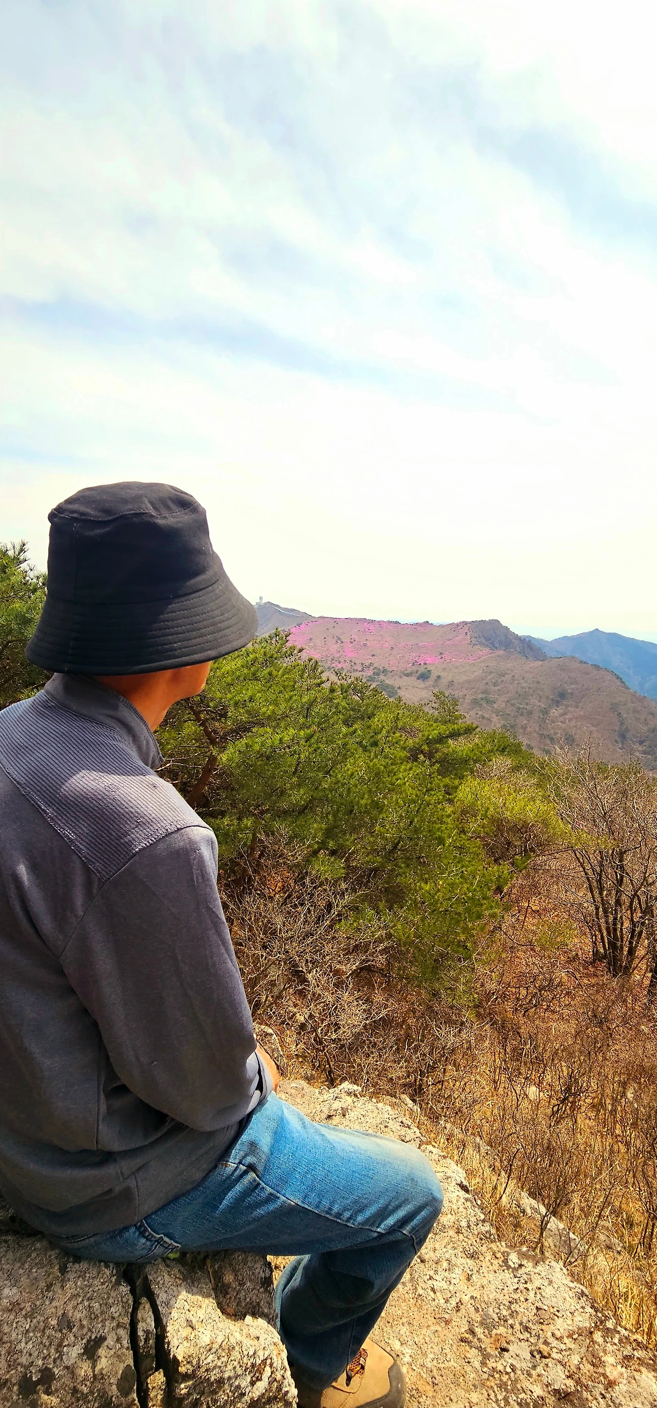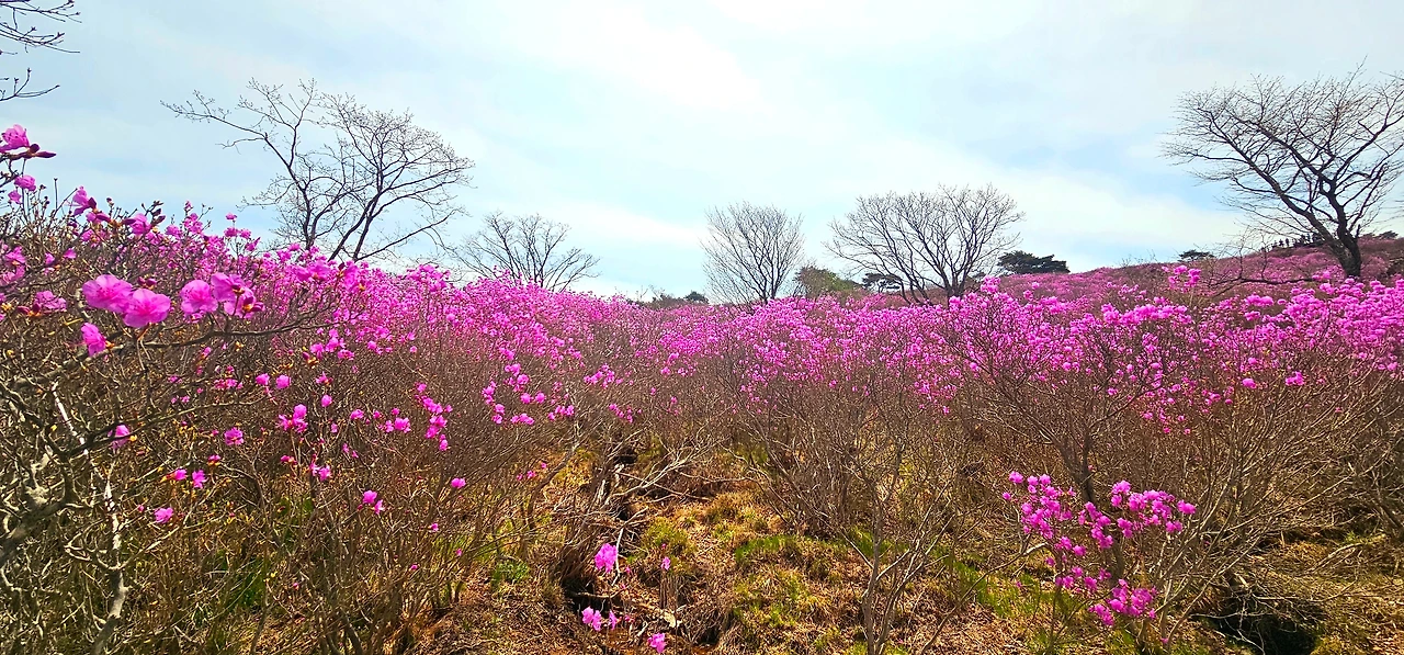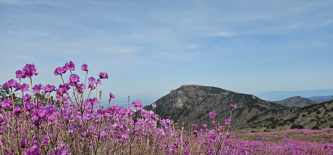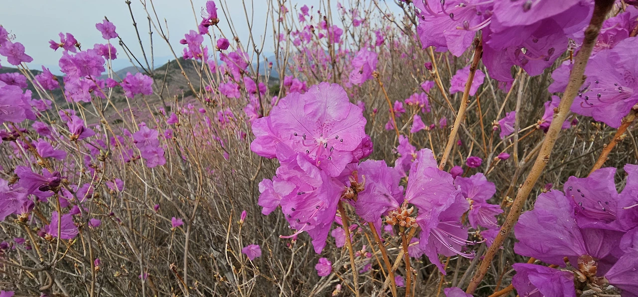 30만 평의 참꽃밭이 한눈에 ㄷㄹ어 오는군요. 오늘은 시계가 좋아 짬꽃밭을 ㅈ나는 사람들도 보일 듯합니다. 맑은 하늘아래 저렇게 깨끗한 분홍빛 세상을 보는 감동에 눈물이 날 것 같습니다.