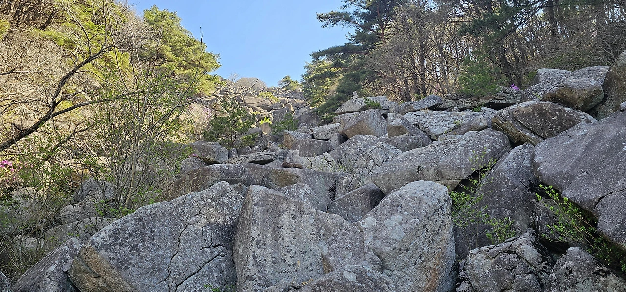 가다가 보면 암괴류에 대한 설명이 있고 오르는 길에 몇 군데 있습니다. 암괴류를 걷는 산책로도 따로 있었습니다. 다른 곳은 길에서 슬쩍 보고 지나쳤지만 이곳 암괴류는 참꽃이 너무 예쁘게 피어있어서 들어가 보았습니다. 바위와 신록과 조화를 이루어 무척 아름답습니다.