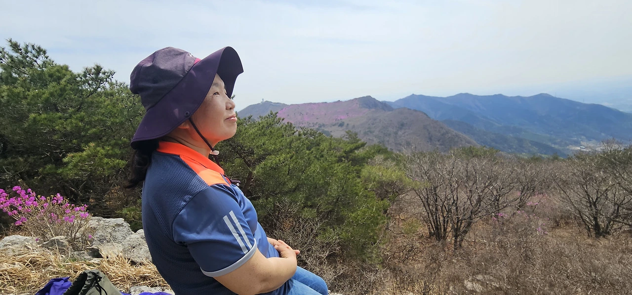 산정상 가까이 올라 점심을 먹었습니다. 빵과 바나나 커피로 때우는 점심이지만 이렇게 참꽃밭을 바라보는 이 자리는 천만 원의 추억머니를 적립해 줍니다.