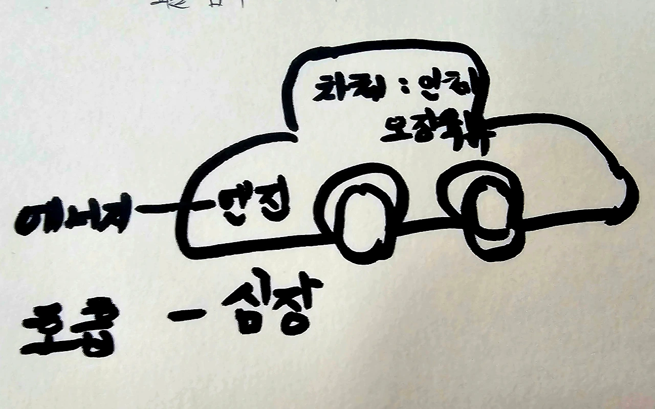 먼저 자동차와 비교해 보면 차체는 오장육부와 팔다리 등 사람의 인체라고 할 수 있다. 연료인 휘발유와 경유 등은 사람의 피와 같다. 자동차에 연료만 채워 놓으면 움직일 수 있나? 아니다 연료를 폭발시켜 에너지를 만들어야 움직인다.