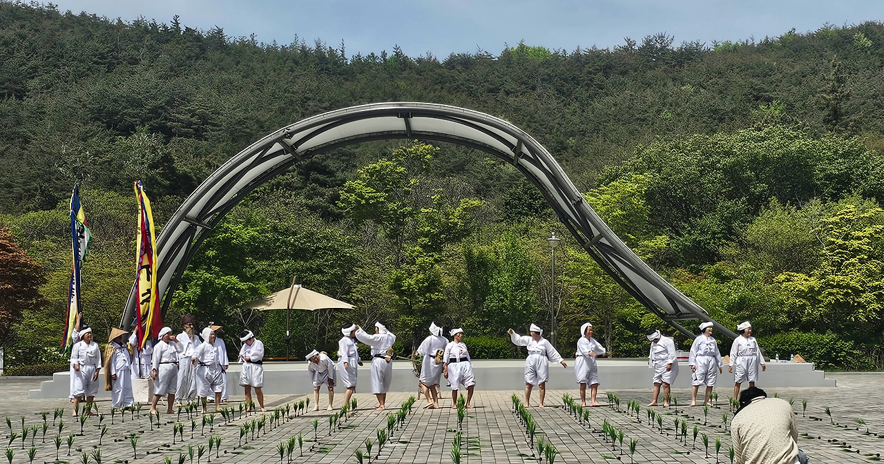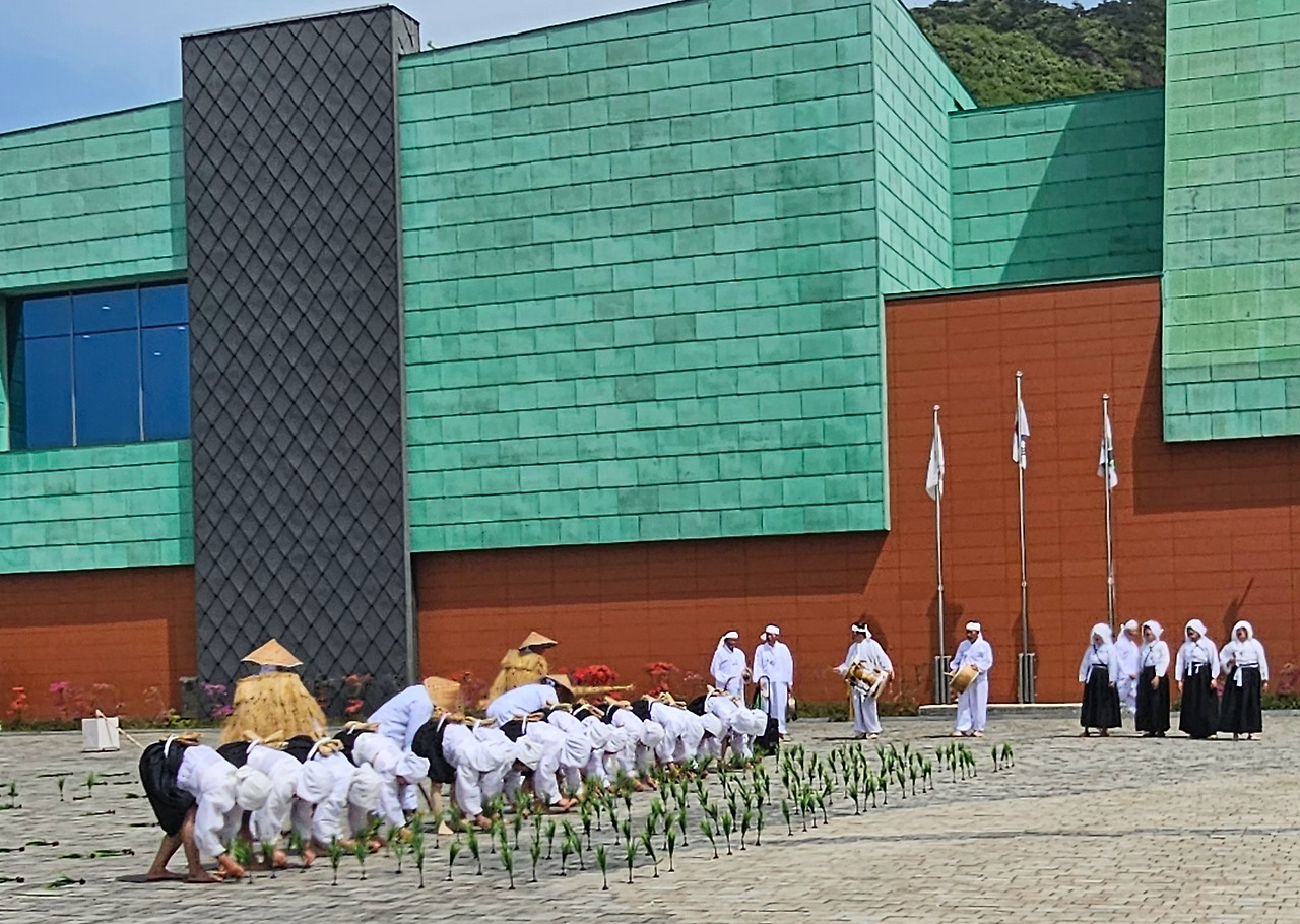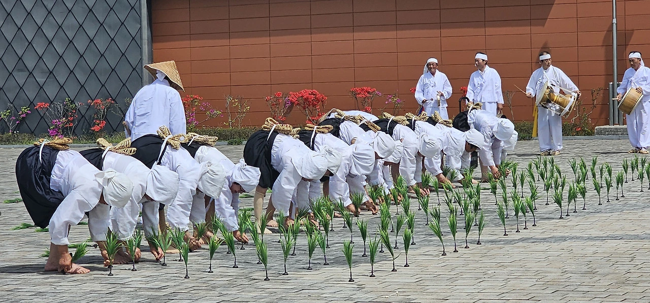 곧이어 모찌기, 모심기, 김매기를 농요와 함께 시연하였습니다. 저도 농촌에서 자랐고 초등학교 다닐 때부터 모내기를 해보았기 때문에 농사짓는 과정을 잘 압니다. 농민들이 직접 시연하는 것이라 더 실감이 났습니다.