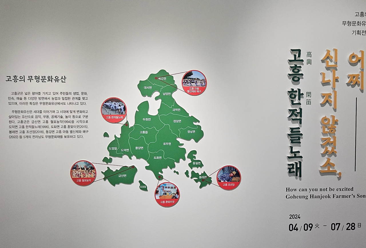 전라남도 고흥분청문화박물관에서 는 농촌의 전통문화를 발굴하고 보존하기 위한 특별전시회를 하는데 24년 4월 9일부터 7월 28일까지 고흥군 도덕면 용동리 한적들노래를 특별전시하고 있습니다.