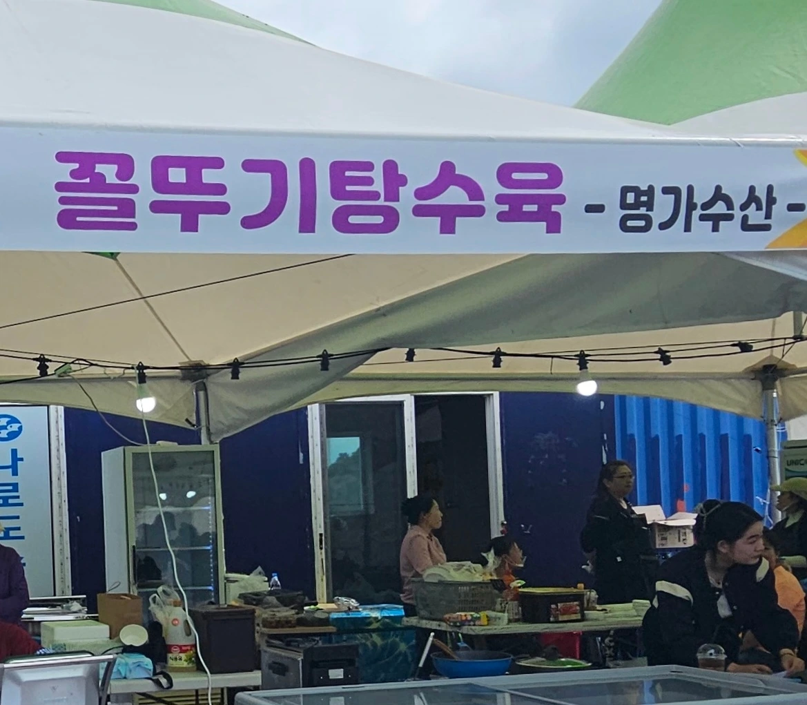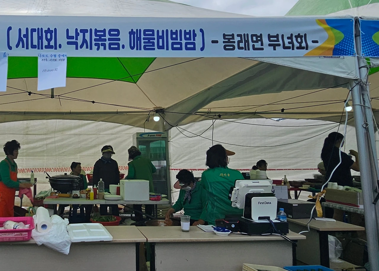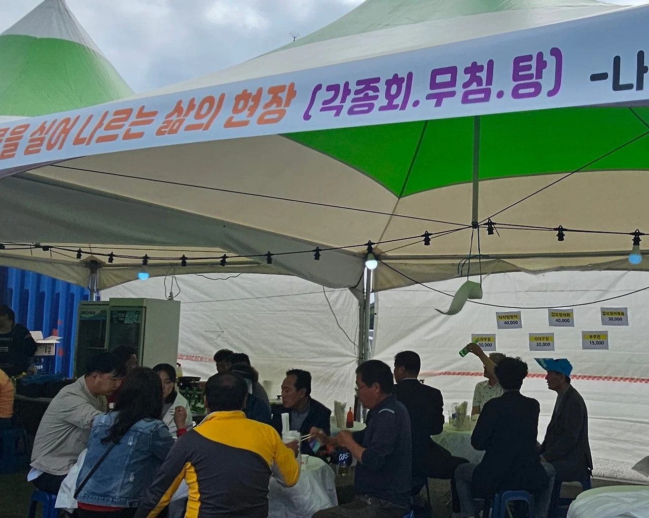 먼저 수협에서 운영하는 부스가 보였다. 맨 앞쪽에 있었는데 나로도에서 나는 음식들을 무료로 시식하는 부스이다. 회, 떡, 물김치, 김치, 전이다. 음료수도 챙겨 주셨다. 토요일인데도 나온 나로도 수협직원들과 자원봉사자들이 운영하는 것 같다. 깔끔하고 맛있는 음식이었다.