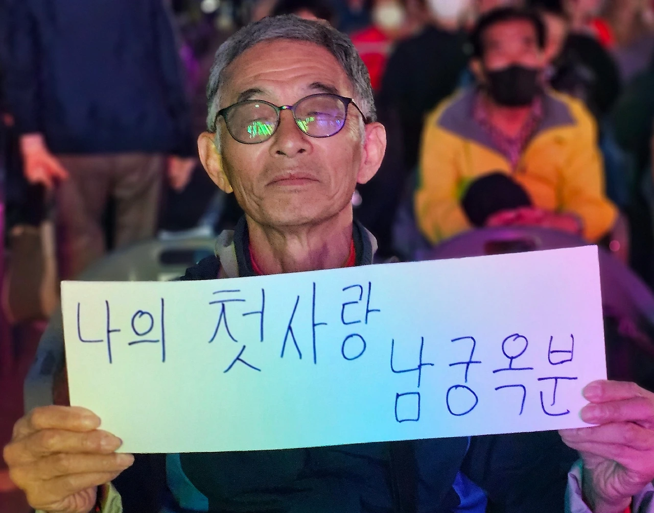 남편은 자기가 적은 피켓을 들고 의자에 앉아 흔든다. 아무리 흔들어보아도 소용이 없다. 남궁옥분 씨뿐 아니라 주변의 누구도 '나의 첫사랑 남궁옥분'이라는 피켓에 눈길을 주지 않는다. 이미 남궁옥분 씨 관심을 받으려는 많은 사람들이 있었고 그들은 무대 앞으로 나와 신나게 춤을 추기도 하고 악수도 하고 있다.