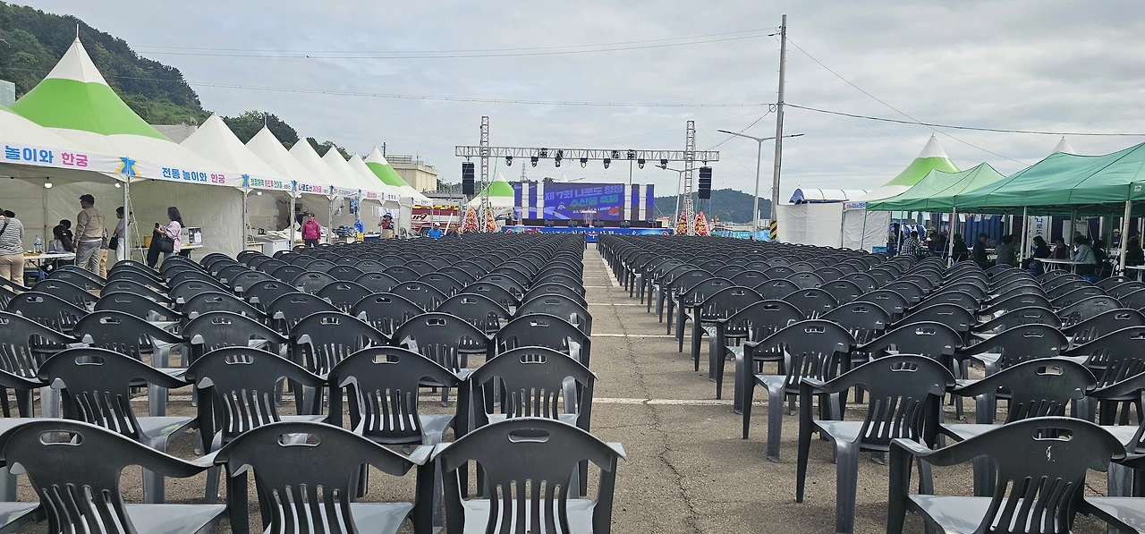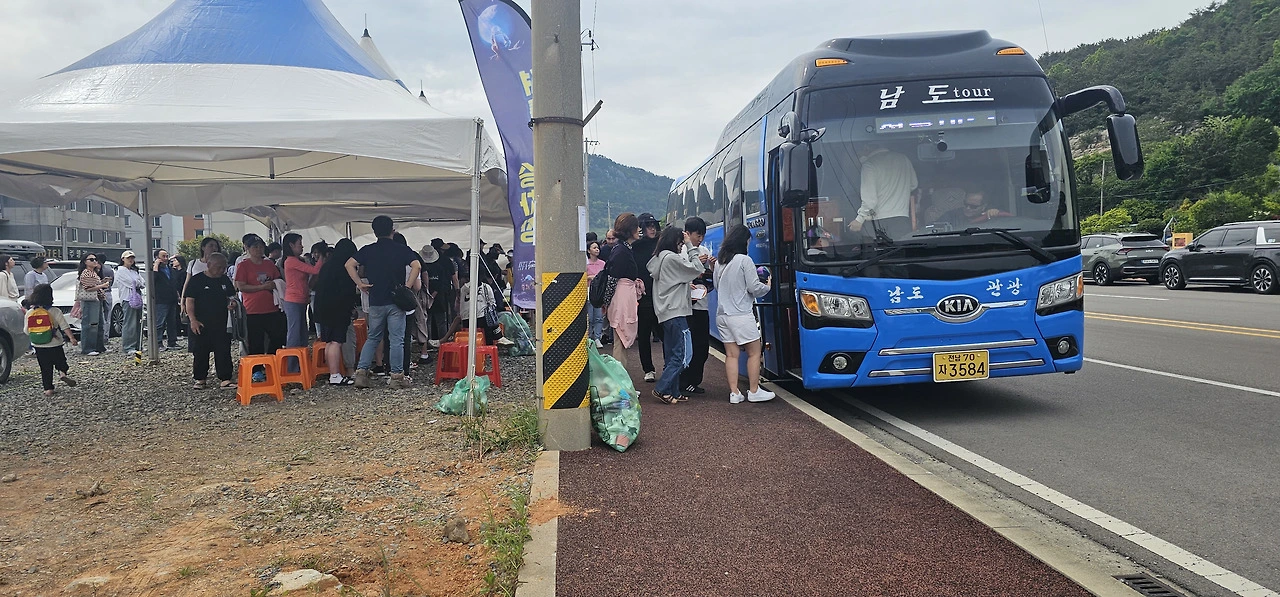 와! 차도 사람도 가득하다. 처음 눈에 뜨인 것은 무료셔틀버스다. 여기서 나로우주센터까지 태워준다고 한다. 본행사장에 가보고 싶지만 공연까지 3시간이 남았다. 갔다 오기엔 시간이 빠듯하다. 눈앞에 있는 쑥섬도 있지만 가기에는 넉넉한 시간이 아니다. 일찍 가서 공연장 맨 앞에 자리 잡을 수 있는 시간이다. 보고 싶고 쓰고 싶은 욕심은 있지만 여유 있게 공연에 집중하기로 하였다.