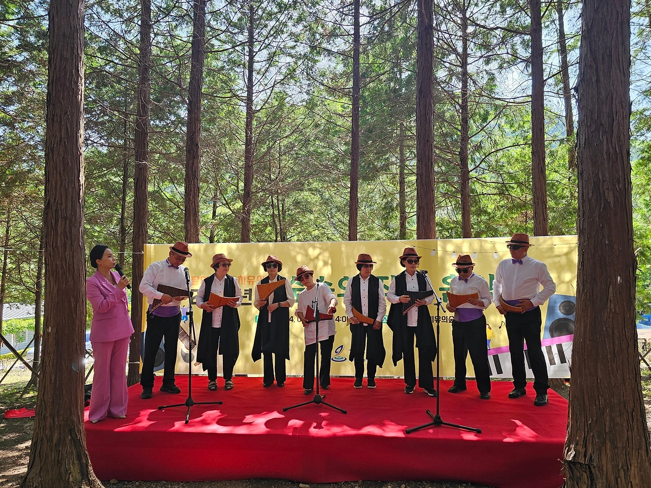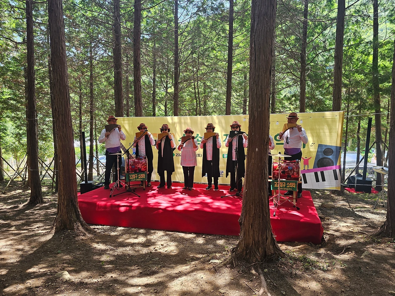 치유의 숲 입구에서부터 음악소리가 들려 산속음악회 무대 앞으로 갔어요. 팬플룻 하시는 동호회 분들이 리허설을 하고 있었는데 언제 들어도 팬플룻 소리는 참 좋아요. 마음과 마음이 부른 먼 곳에 있나요?를 합주하시는데 우리 젊었을 적 좋아하던 노래라 귀를 쫑긋 세우고 다가갔어요.