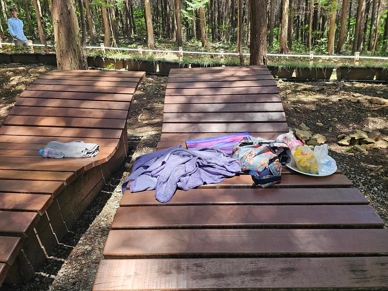 어쩐지 편안해 보이는 이 의자, 바닷가에 있으면 비치의자고 숲 속에 있으니 산림욕의자라고 하겠습니다. 저는 이 자리에 앉고 싶은데 누군가가 미리 자리를 잡아 두었네요. 좋은 자리에 물건을 얹어두고 있는 행태는 공연장 어디서나 있습니다. 씁쓸하기도 합니다.