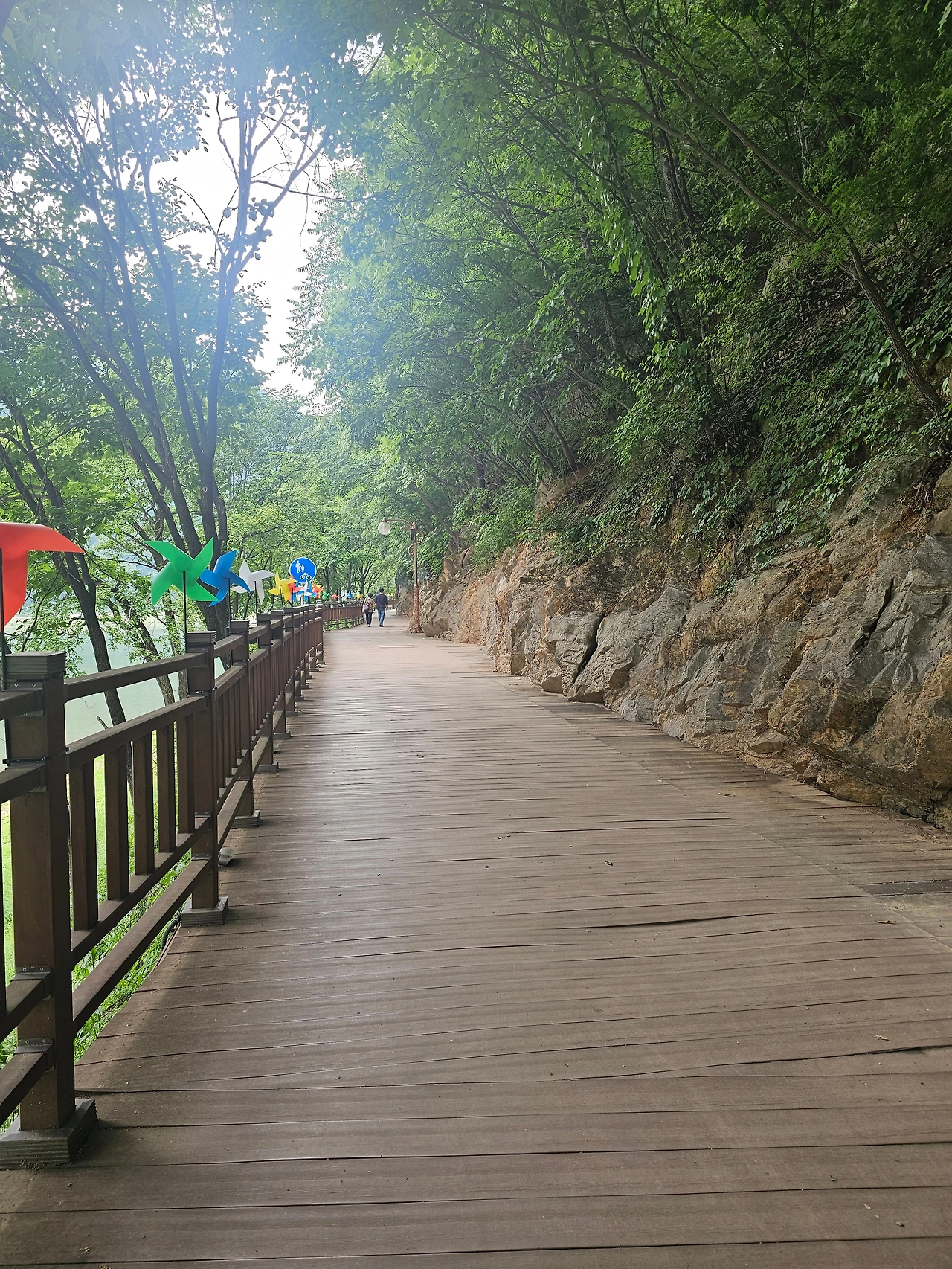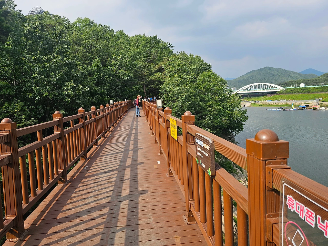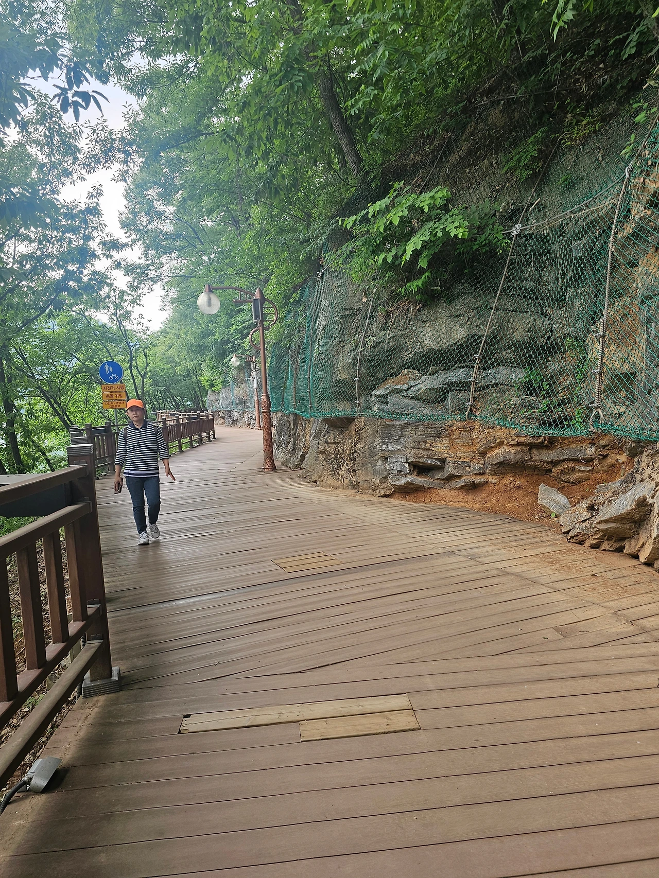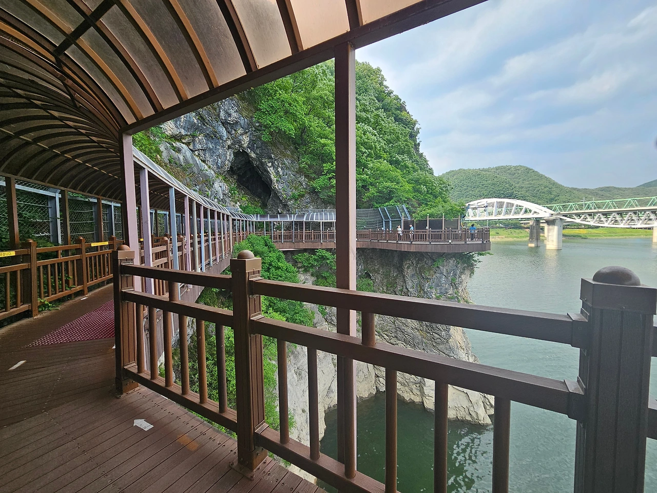 강을 따라 절벽길에 위로. 데크길이 놓여 있습니다. 강도 있고 그늘도 있는데 경치가 아름다우니 걸음이 절로 나갑니다.많은 사람들이 걷고 있습니다.