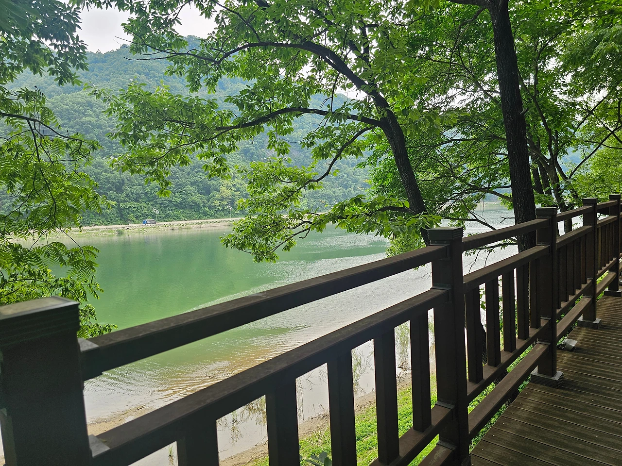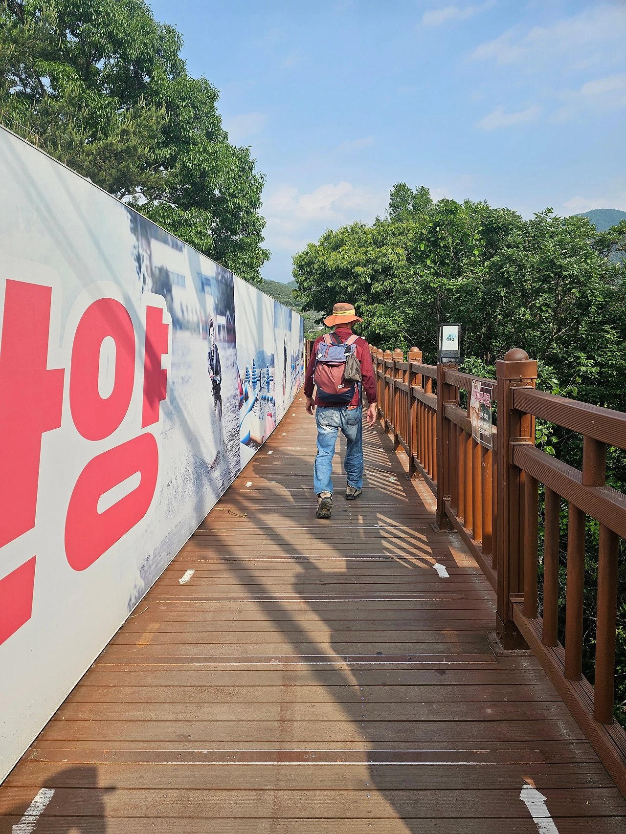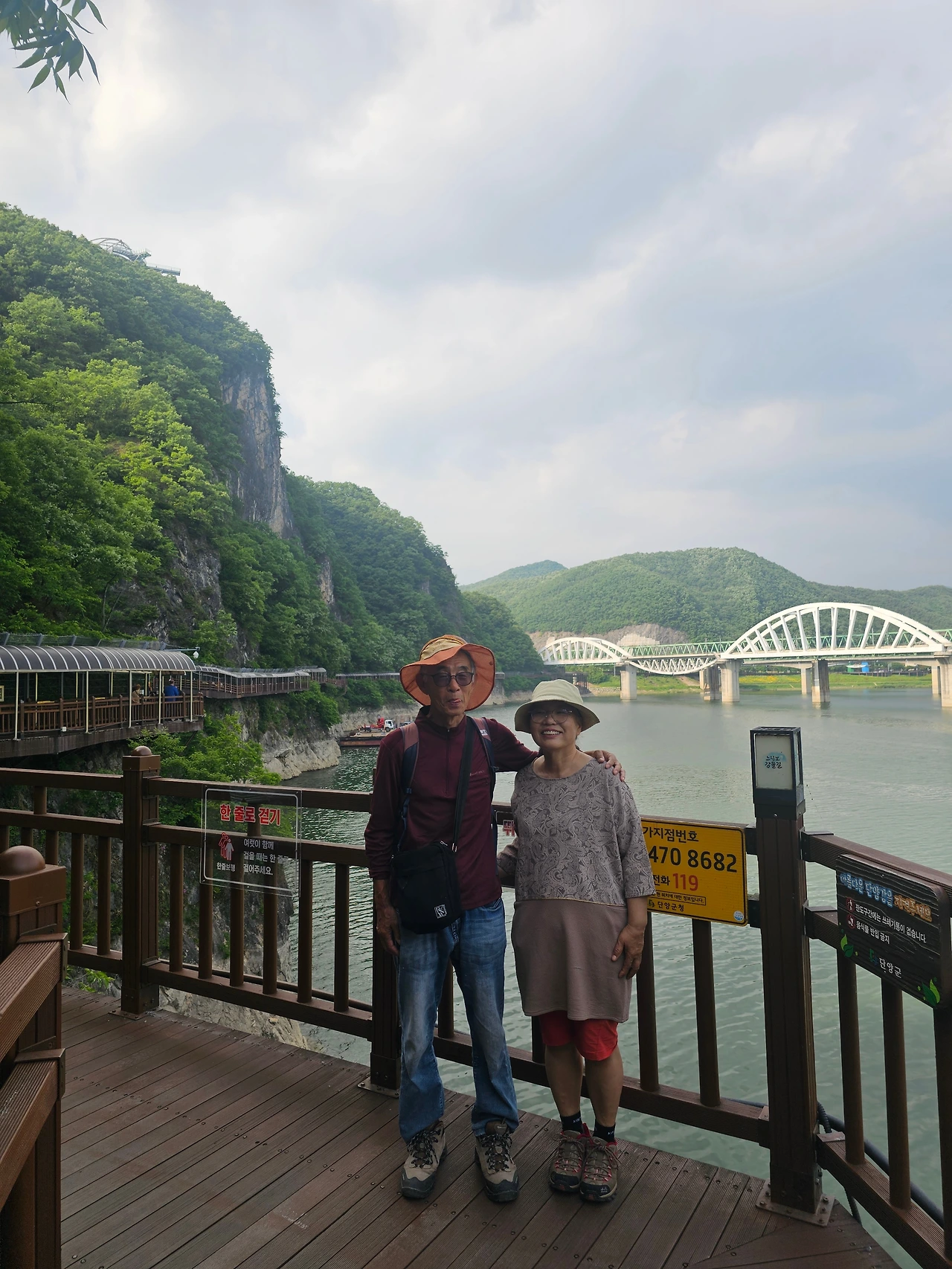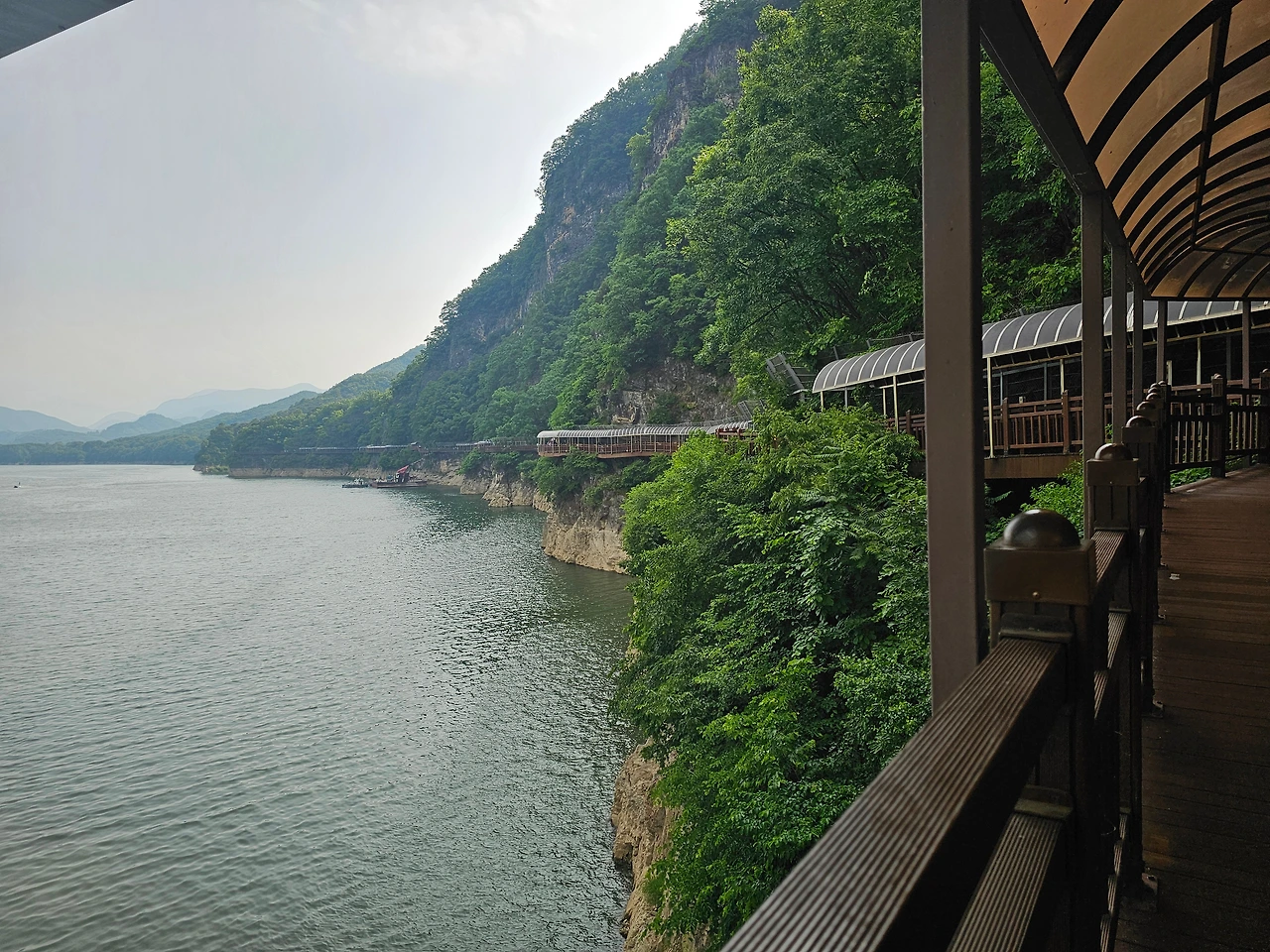 강을 따라 절벽길에 위로. 데크길이 놓여 있습니다. 강도 있고 그늘도 있는데 경치가 아름다우니 걸음이 절로 나갑니다.많은 사람들이 걷고 있습니다.