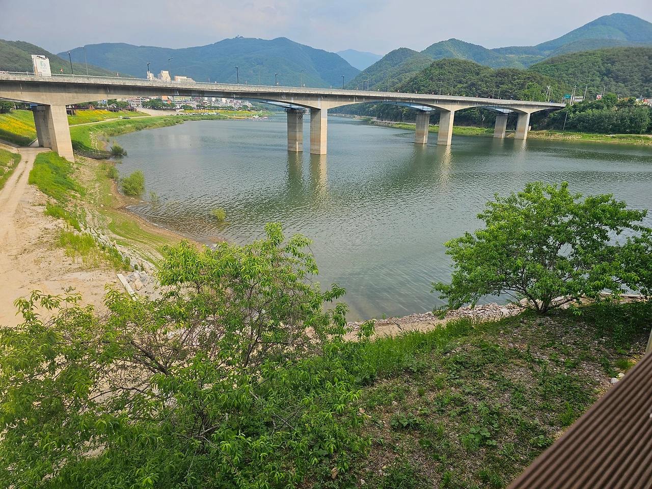그 후 차 뒷문을 열었습니다. 남한강이 바라보입니다. 그 뒤로는 아직도 신록빛을 자랑하는 산이 있습니다. 산 위에 패러글라이딩장도 바라보입니다.