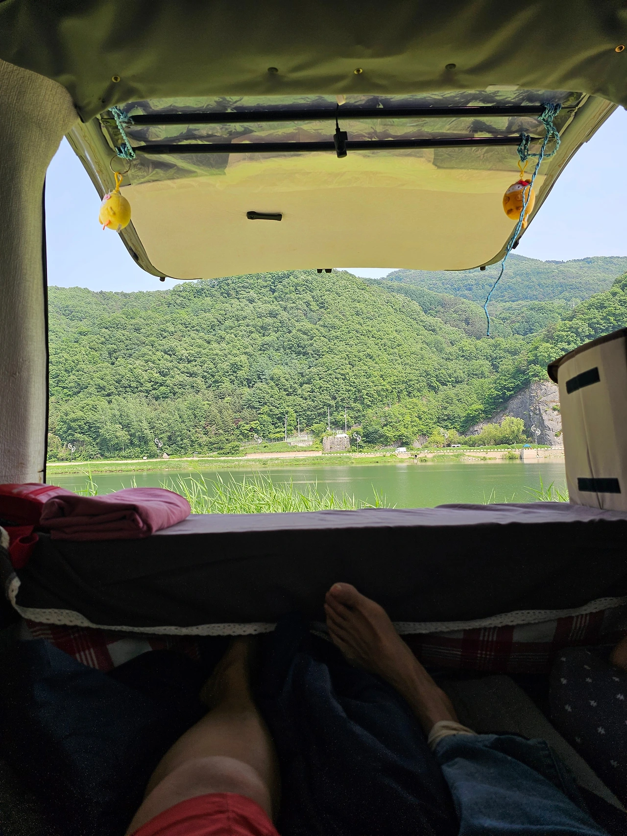 여기는 단양축제잠 주무대 아래 있는 수변 주차장입니다. 시원한 바람이 불어옵니다. 뒷문으로 자연이 들어오니 마음이 설레며 행복합니다. 집에 누워있는 것보다 이런 자연 속에서 쉬는 게 더 익숙해진지는 오래되었습니다.
