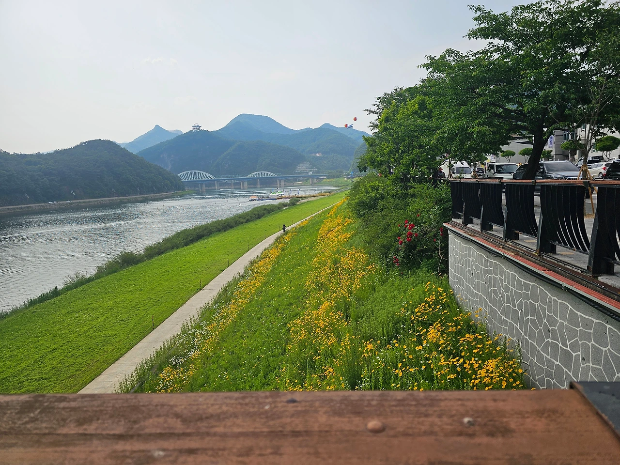느리게 흐르는 강물과 둔치의 초록초록 풀들이 눈과 머릿속이 맑아집니다. 금계국이 피어 남한강을 더욱 빛내줍니다.