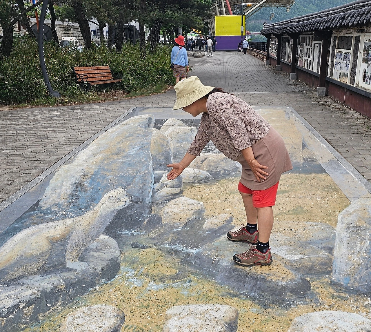 출발지에 트릭아트가 설치되어 있어 사진 놀이 합니다.환갑도 넘은 저가 아이처럼 이런 것이 왜 재미있는지 모르겠어요.