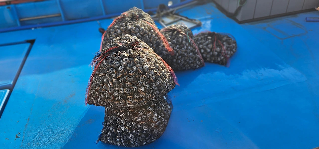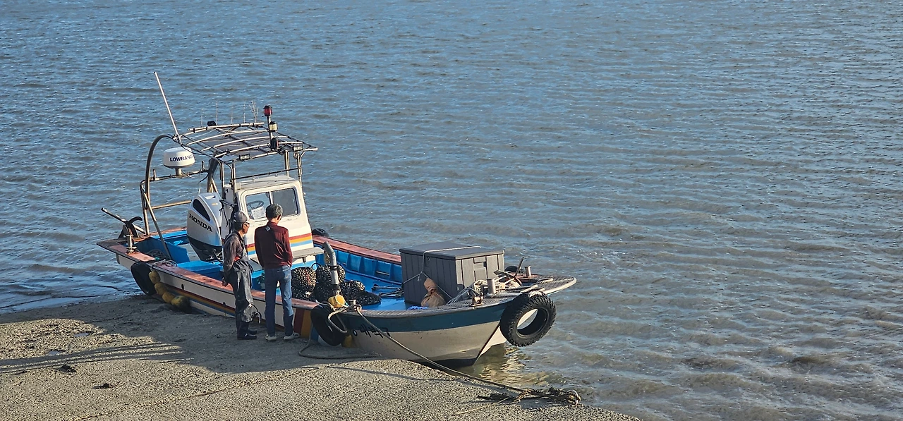 심심하게 앉아 있는데 죽도로부터 배가 한 척 들어옵니다. 부부가 타고 왔는데 부인은 어디론가 가고 어르신이 혼자 계셔서 내려가 보았습니다. 바지락을 배에 가득 싣고 오셨습니다.