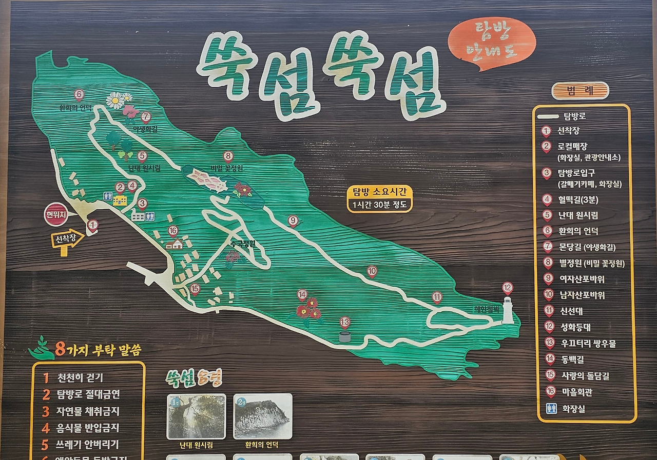 쑥섬은 천천히 돌아도 2시간 정도의 시간이 소요되는데 힐링포인트에서 많이 쉬어갈 예정입니다.