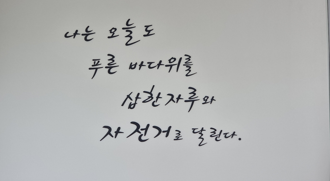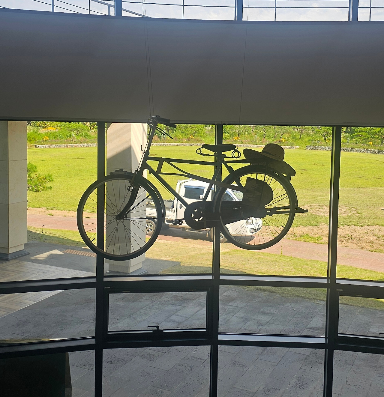 이제 2층으로 올라갑니다. 계단 위에 자전거가 달려있고 글귀가 있습니다. 이곳 간척지를 누비고 다니신 김세기 회장님의 자전거입니다.