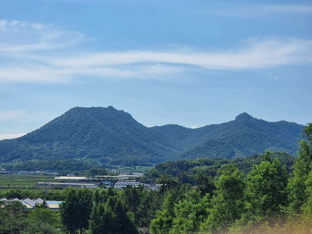 서쪽으로는 여인이 누워서 머리를 감고 있는 모습을 한 두방산이 보입니다. 병풍산이 똑 튀어나온 배꼽이라는군요. 지난번 두방산 등산 때 잔뜩 까었던 해무로 바다와 육지의 구분이 잘 가지 않았던 곳이 바로 여기었구나