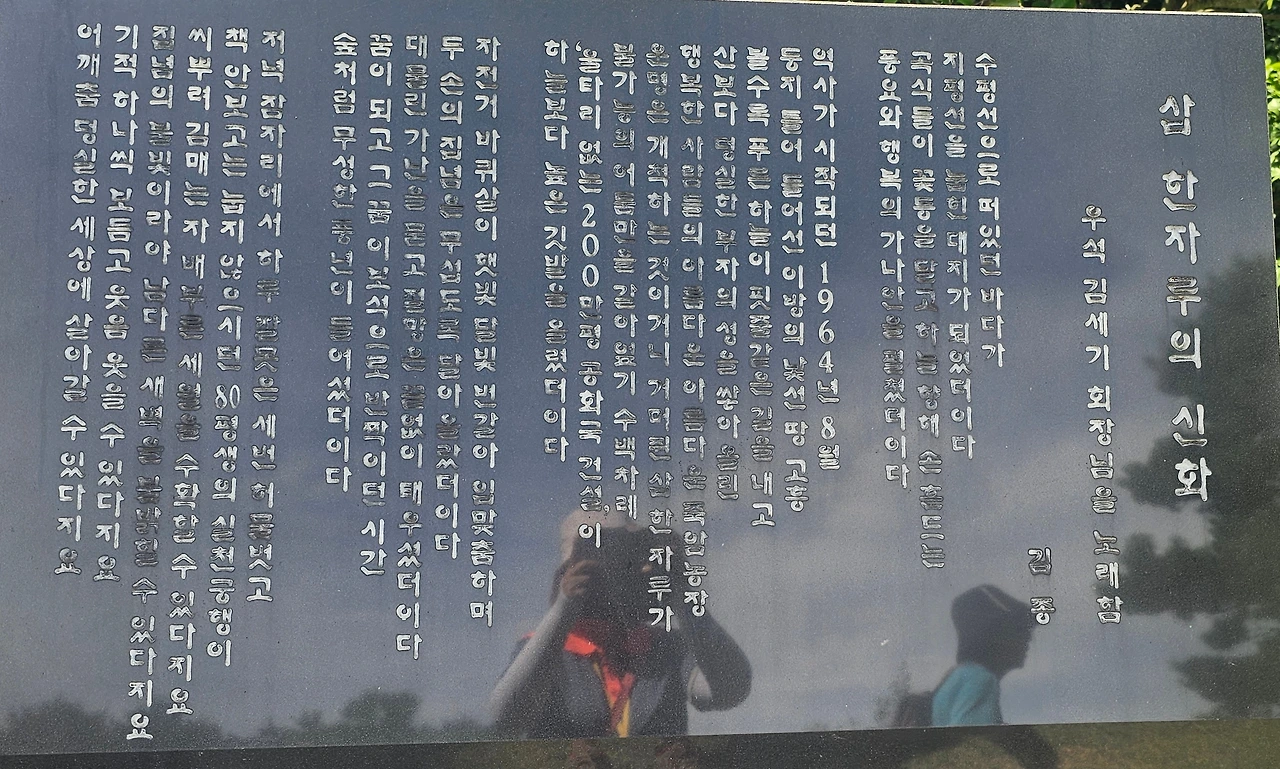 저는 요즘 들어 방조제를 많이 가보았는데 진도에 있는 윤선도가 쌓은 고산둑처럼 조선시대에 쌓은 둑도 있는데 쌓아놓으면 무너지고 또 파도가 쓸어가 버리고 하는 바람에 둑을 쌓기가 어려웠다는기록들을 보곤 했습니다. 그 삽 한 자루와 신화를 이뤄내기 위한 김세기 회장님과 작업자들의 노고가 느껴집니다.