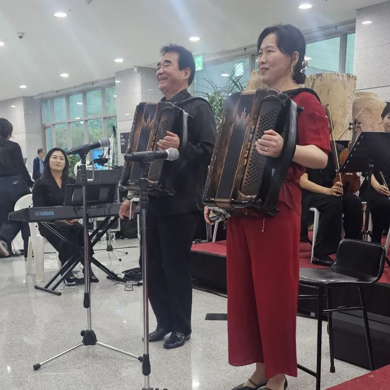 전남의 한 대학교 동문들로 구성되었다는 오케스트라 단원들과 세계적인 지휘자라는 오준혁 지휘자의 지휘로 잔잔하고 경쾌하고 때로는 애잔한 연주가 이어졌습니다. 첫곡은 페르시아마켓이었습니다. 경쾌한 리듬이 흐르더니 가슴을 파고드는 감미로운 선율로 바뀌고 새들이 속삭이는 듯한 자연의 음이 연주되다가 단원들의 목소리와 악기의 하모니가 홀을 채웁니다. 다시 감미로운 선율의 음악으로 또 행진곡 풍의 경쾌한 멜로디가 흐르다가 클라리넷 독주의 은은하게 흐르는 음악 그다음 지휘자의 손과 악기가 한음으로 모였습니다. 짜잔^^ 고요함이 흐릅니다. 마지막 부분은 병 맛입니다. 오오 브라보~~~