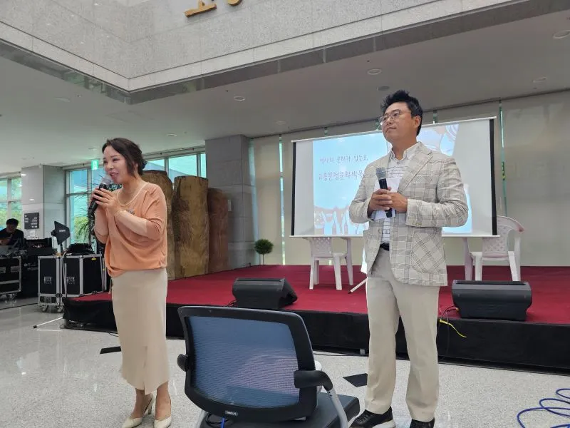 공연이 시작되기 전부터 사회자는 관객과 호흡을 함께 합니다. 앞 좌석부터 사람을 앉히기 위해 고군분투합니다. 경품을 걸었더니 관객들의 호응이 있습니다. 앞 좌석부터 가득 찼습니다. 먼저 분청사기 팸플릿 틀리지 않고 읽기입니다. 먼저 손을 든 순천여고 동창생 분 중 한 분은 틀리고 기회를 먼저 얹은 초등학생도 마지막 부분에서 틀려 아쉬워하고 있었습니다. 귀에 익은 목소리가 들려 쳐다보니 남편이 읽고 있었습니다. 한자도 틀리지 않았습니다. 남편이 소리 내어 글을 잘 읽는다는 것을 처음 알았습니다. 최초로 성공하여 박수도 받고 경품도 받았는데 우산이었습니다,