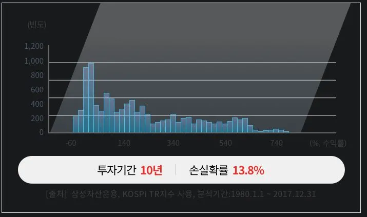 두 번째로는 앞에서 말한 것처럼 시간을 투자해 버는 돈일수록 리스크가 적어진다는 점을 이해할 필요가 있다는 것입니다. 한 분석자료에 따르면, 1980년 1월 1일부터 2017년 12월 31일까지 하루씩만 투자했을 때는 51.3%의 투자자가 수익을, 48.7%의 투자자가 손실을 입게 된다고 합니다. 과반수 이상의 투자자가 수익을 입은 것이지만, 평균 수익률은 겨우 0.03에 불과합니다.