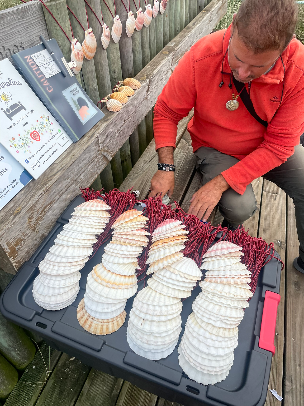한창 해안 길을 따라 걷는 도중에 쎄요를 받아 가라는 한 남성이 만났다. 그의 작은 데스크에는 가리비들과 까미노 관련 책처럼 보이는 안내 책들, 그 옆에는 목걸이인가 싶은 조개들이 펼쳐져 있었다. 우리 셋은 한참을 서서 포르투갈 까미노 길에 대해서 이야기를 나누었고, 그 남성은 우리에게 세상의 끝, 피에스테라에 대해서 이야기해 주었다. 이때까지만 해도 난 그곳에 대해서 완벽하게 알지 못한 채 흘러갔다.