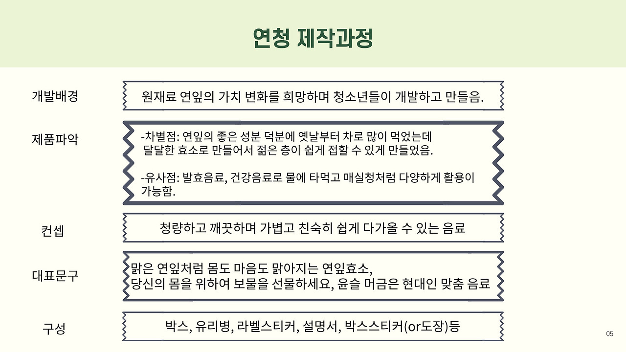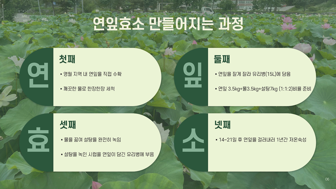20~30대를 주요 타깃으로 삼아 피로를 덜어주고 마음의 안정을 주는 '달콤한 음료'콘셉트로 기획했다. 연잎이라는 자원을 직관적으로 보여주는 로고를 만들고 지역에서 이어오던 가치 효소 프로젝트를 상품으로 확장해 의미를 담았다. 프로젝트 과정에서는 지도사 선생님뿐 아니라, 영월의 파고디자인 대표님이 디자인 멘토로 함께해 주셨고, 사회적 기업 '화이통' 양승우 대표님의 사업 마인드와 지역 자원 활용 방식 등 실제 판매와 연결되는 중요한 부분을 멘토링해 주셨다.