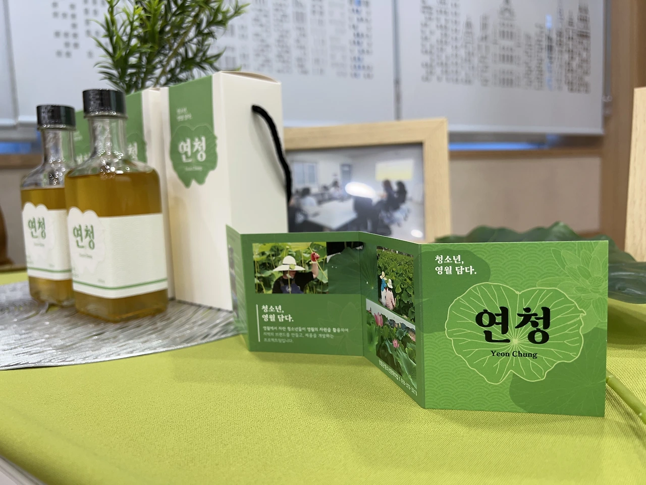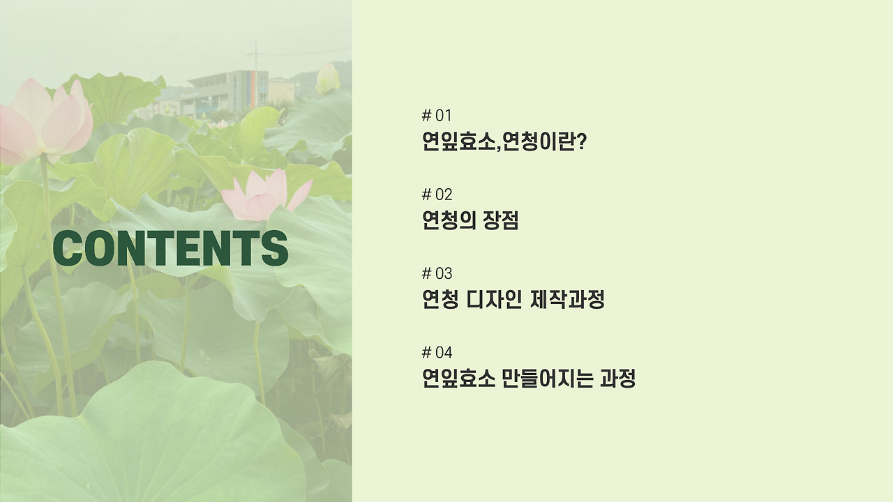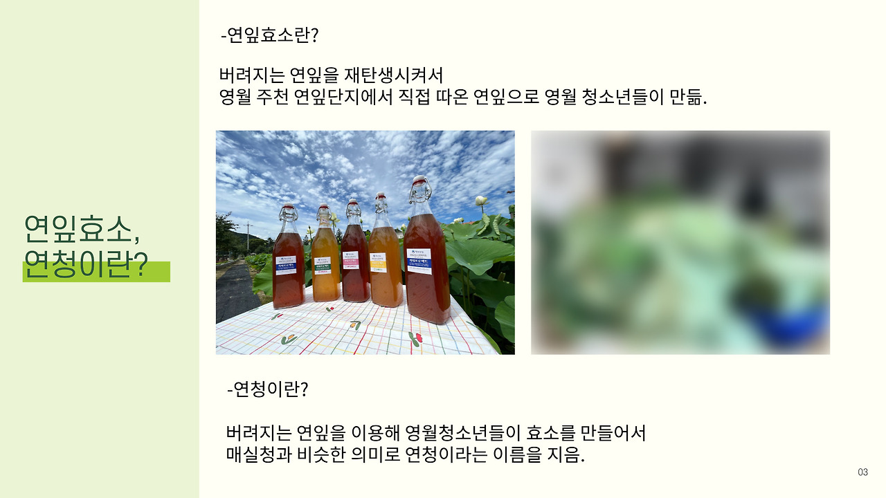 '영월 담다 프로젝트'는 영월에서 자란 청소년들이 지역 자원을 활용해 브랜드와 제품을 만드는 프로그램이다. 우리 팀은 주천에서 흔히 볼 수 있는 연잎을 활용해 청소년들이 만든 '연잎 효소'를 사용하여 이름은 '연꽃의 연'과 '꿀'의 의미를 가진 '청'을 더해 연청(蓮淸)이라 지었다.