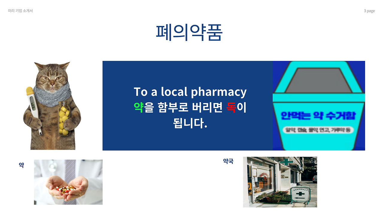 인간의 생활 속에서 자연과 동물들은 살아남기 힘들어졌다. 그런 현실을 떠올리면 마음이 아프다. 폐의약품 역시 같은 문제였다. 약국이나 병원에서 처방받았다가 중간에 복용을 중단하거나 과다 처방된 약들이 그대로 버려진다. 많은 사람들은 남은 약을 하수구, 변기, 일반 쓰레기와 함께 버린다. 하지만 이는 심각한 환경 문제를 일으킨다. 하수 처리 과정에서도 약물 성분이 분해되지 않은 채 하천과 강으로 흘러가 생태계를 교란한다. 일부 항생제나 호르몬 성분은 내성균 발생까지 유도할 수 있다.