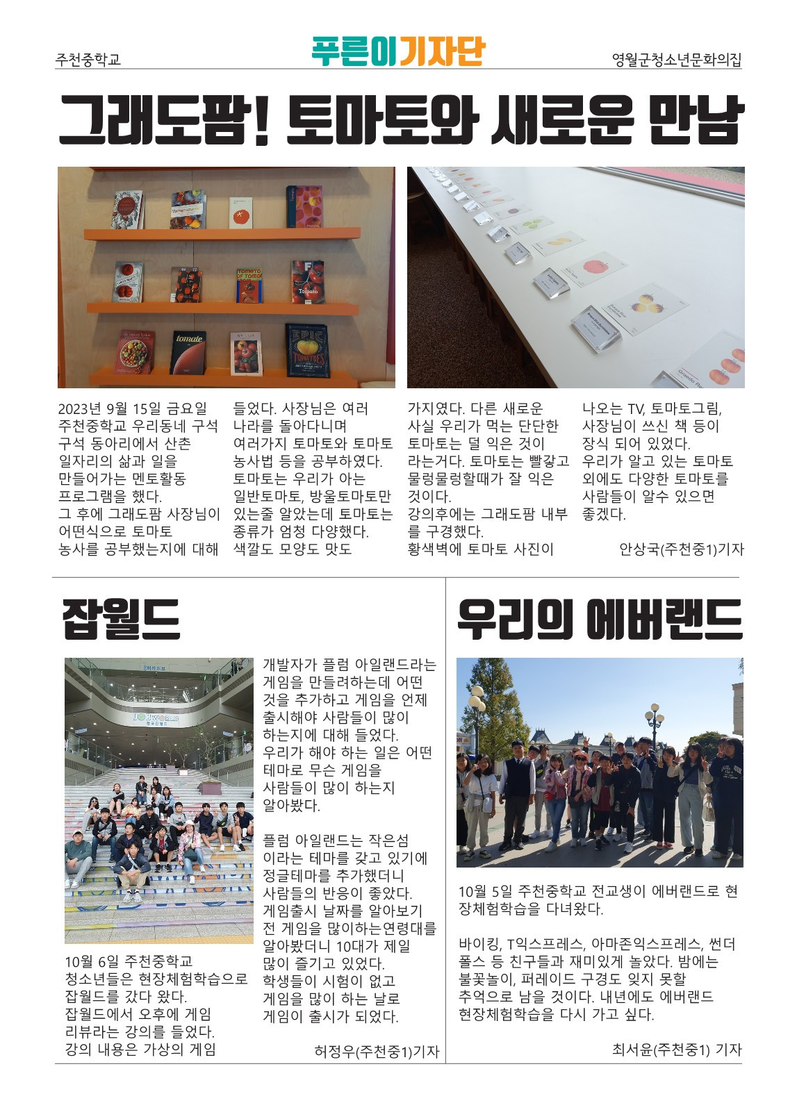 4주 차 11월 28일 마지막 수업에서는 드디어 1학년 푸른이기자단이 만든 신문을 주천면 곳곳에 배포하는 활동을 진행했다. 이번 신문은 주천면 근처 배포되었다. 1학년 학생들이 직접 취재하고, 사진을 찍고, 기사를 작성해 만든 신문이었다.