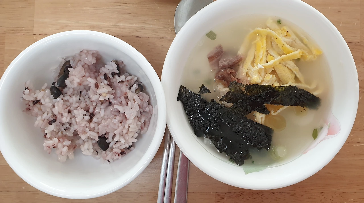 짜잔! 떡국이 완성되었다. 우리 아내 떡국을 보더니 "떡국 끓였어?" 하며 살며시 뽀뽀도 해 준다. 아내와 딸 아들 모두 잘 먹으니 아침부터 뿌듯하다. 내 자신의 라이벌인 게으름을 이겼더니 운동도 하고 설거지도 하고 맛있는 떡국도 만들었다.