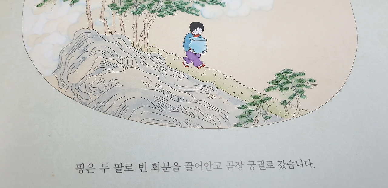 결과는 어떻게 됐을까? 너무 궁금했다. 임금님은 모든 아이들이 들고 온 각자 예쁜 꽃들을 바라보았다. 그런데 임금님의 표정은 좋지가 않았다. 드디어 핑의 차례가 왔을 때 혼자만 빈 화분을 들고 온 핑은 부끄러워 고개를 들지 못했다. "왜 빈 화분을 들고 왔냐?"는 임금님의 말에 핑은 아래와 같이 솔직하게 대답한다.