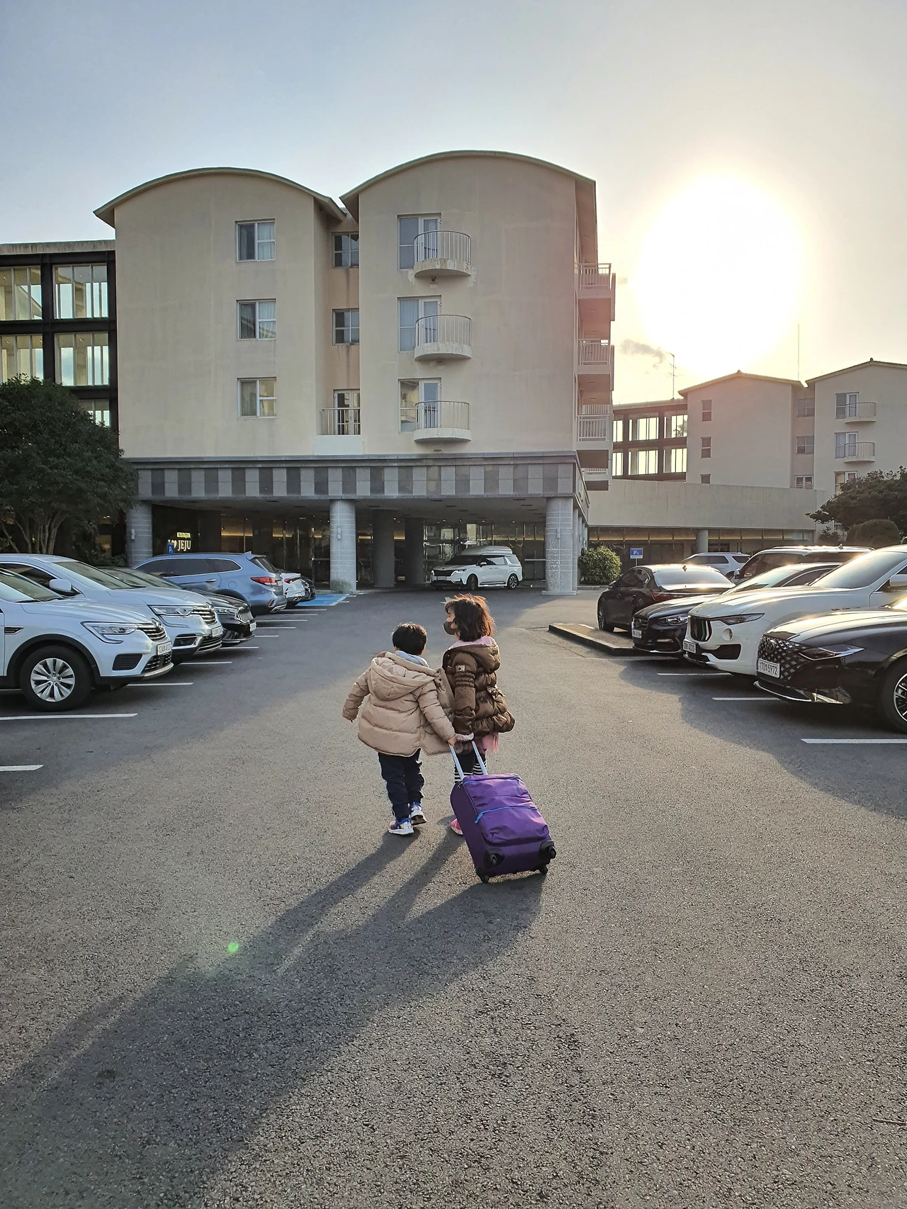 이삿짐은 오늘 보냈으니 배로 내일 온다. 빈 집에서 잘 수 없어 아내가 집 근처 숙소를 하나 잡았다. 애마 타고 숙소 오는 길, 차들이 안 보이기 시작하고 오름과 구름, 바다가 보이니 기분이 업된다. 아이들도 신이 났다.