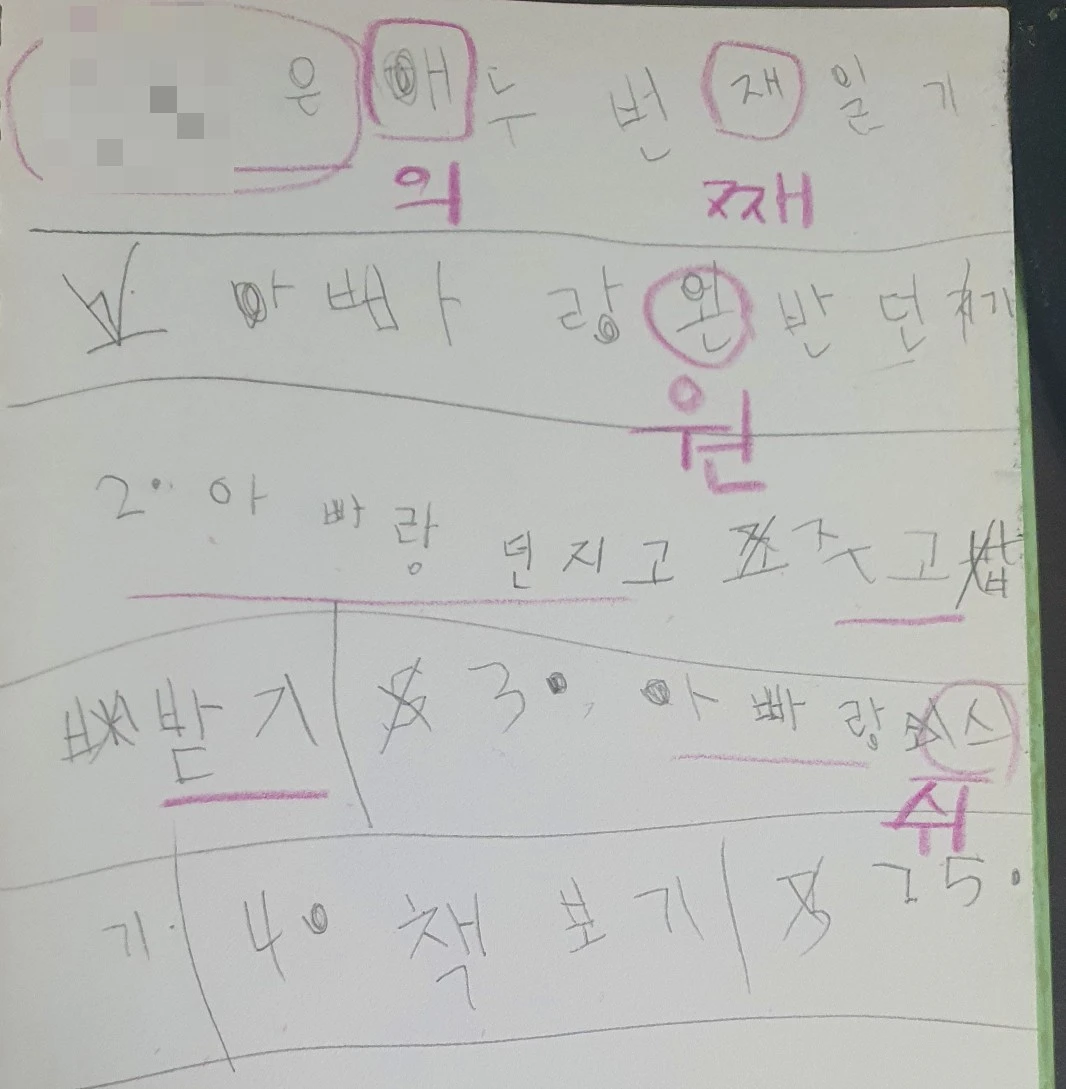 뭐라고 길게 오늘 하루를 정리했는데 요지는 역시 아이들과 제대로 놀아줘야 한다는 거고, 자연이 주는 경이로움과 신비로움은 그 자체가 마음의 치유가 됨을 느낀 하루였다는 거다. 아 맞다! 아이와 함께 하루를 계획하라고 해서 아이들과 계획도 세워 하루를 보냈다. 한 것도 있고 못 한 것도 있지만 무엇보다 아이가 직접 하고 싶은 걸 적고 실천했다는 자체가 중요한 거라 생각이 든다.
