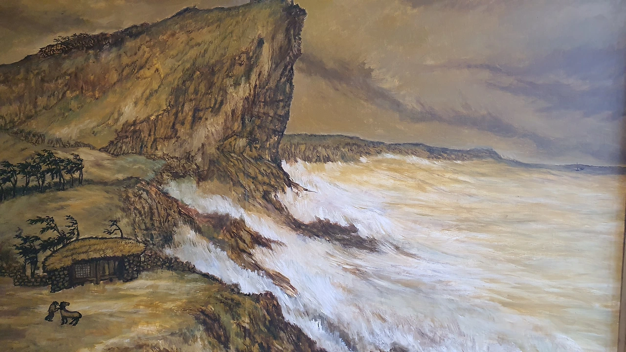 "아빠, 나 도서관 갈래. 여기 재미 하나도 없어. 그림만 있고 뭐야?" 하며 둘러보지도 않고 다시 들어왔던 문으로 나가려고 한다. 그림 속에 등장하는 '모과'랑 '연탄'도 물어봤지만 딸아인 본체 만 체다. 아내가 아이들을 도서관으로 데려가 줘서 혼자 한 10분 정도 그나마 그림을 제대로 본다. '변시지' 화가의 그림이 내게 울림을 준다. 세 찬 파도와 말 그리고 한 남자와 집. 색감이 토속적이고 내용이 단순하다. 미술을 전혀 모르지만 이중섭 작품 느낌도 살짝 나고 뭔가 외로우면서 제주도와 자연을 사랑하는 한 남자의 고독이 찐하게 느껴진다.