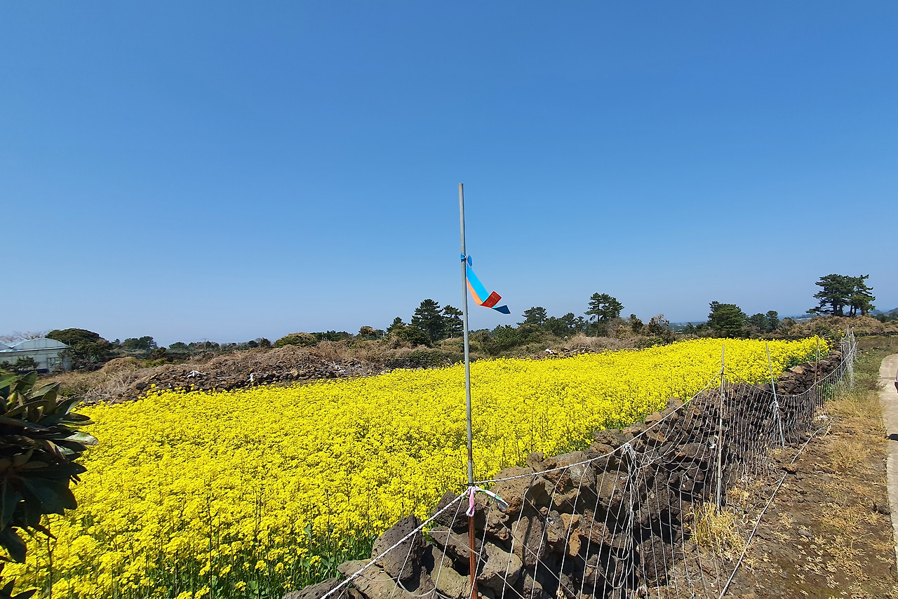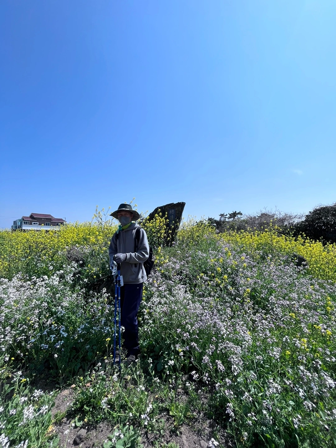 하산이다. 알오름부터 종달리 마을까지 가는 길. 노란 유채꽃과 연한 핑크빛 무꽃 그리고 찐 보라 제비꽃이 곳곳에 활짝 피어 봄을 알리고 있다. 바람은 아직 차가운데 태양은 벌써 뜨겁다. 모자에 장갑에 스틱까지 모든 장비를 갖췄더니 뜨거운 햇볕도 전혀 무섭지가 않다. 아내랑 오래전 친구 이야기와 부모님 이야기를 하며 좋은 사람들을 떠올리며 이 아름다운 제주 올레길 봄길을 걷는다.