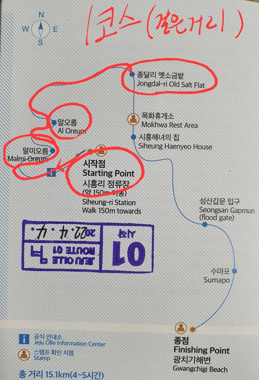 *올레길 1코스 오늘의 코스 서귀포 중앙로터리(101번 버스)- 성산고 입구 삼거리-201번 환승-시흥리 하차(올레길 1코스 출발지)- 말미오름- 알오름- 종달리 옛 소금밭-목화휴게소(중간지점)