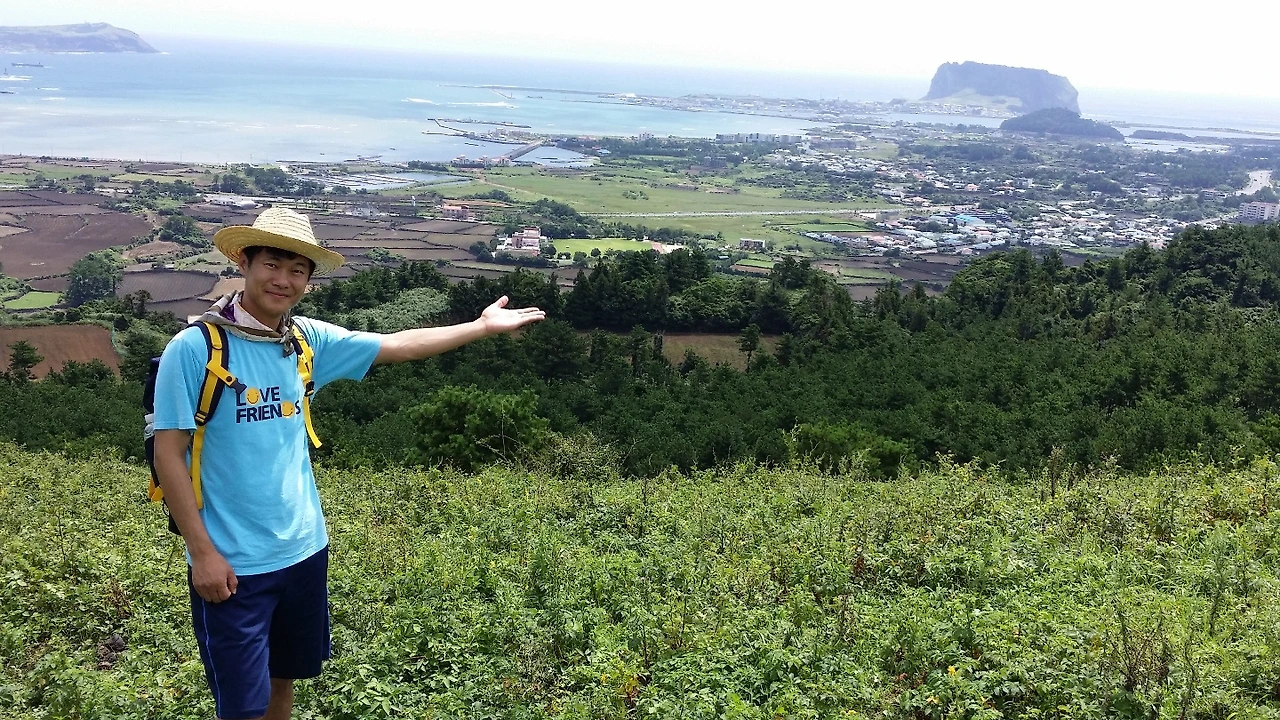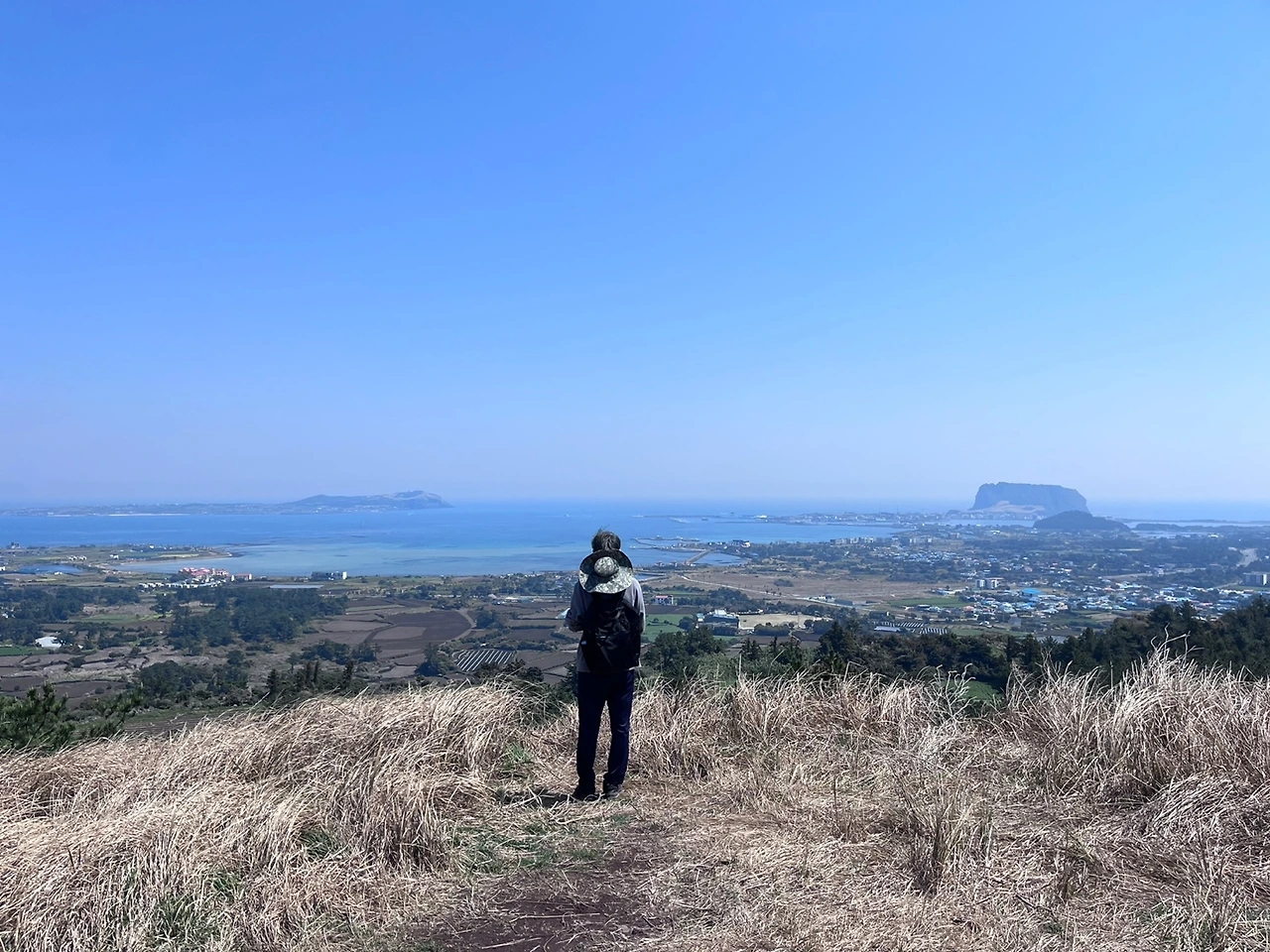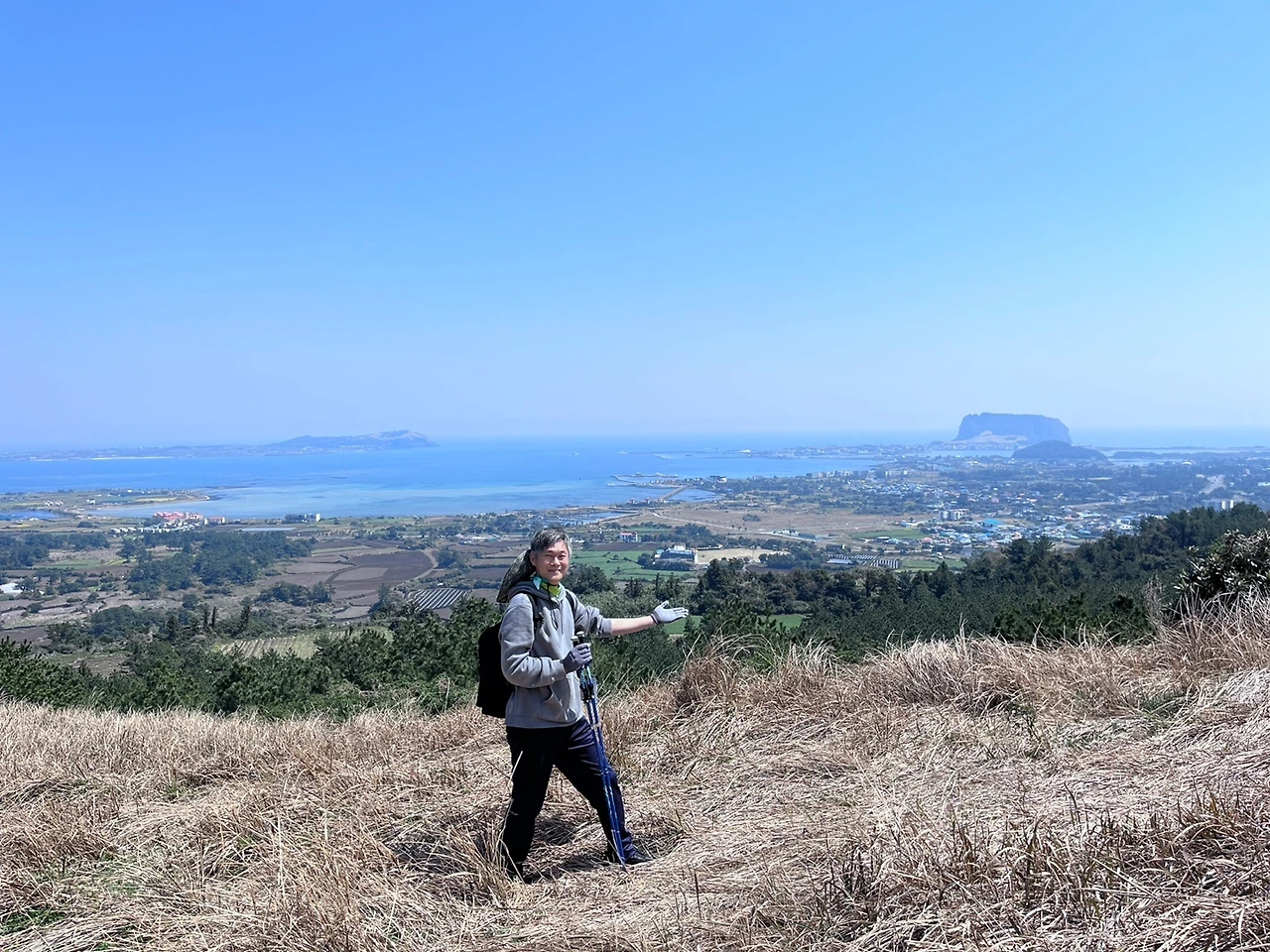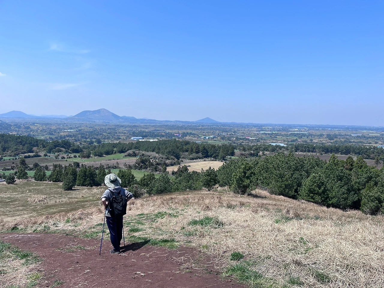 8년 전 코스프레를 해 보려고 하는데 똑같은 장소를 찾기가 생각보다 힘들다. 알오름 정상에서 가장 비슷한 곳을 찾았다. 아내가 연신 찍어주는데 장소는 비슷하다. 근데 얼굴이 영 아니다. 8년 동안 이렇게 얼굴이 갈 수가 있단 말인가? 풍경은 예전처럼 똑같이 아름다운데 얼굴은 차마 눈뜨고 볼 수가 없다. 오늘도 아내가 사진을 찍어 주었다.