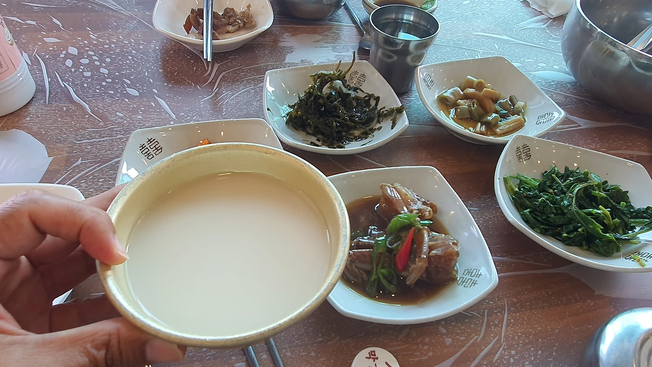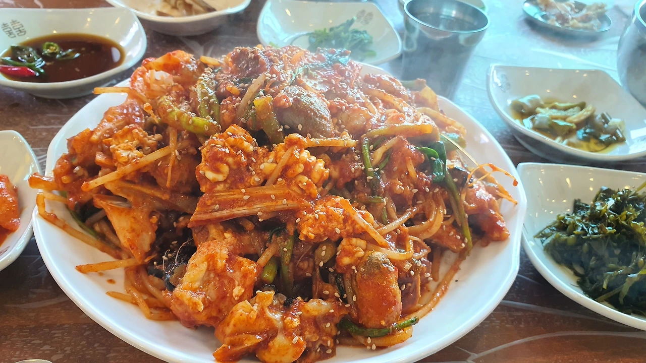 기본 밑반찬인 간장게장과 해초무침 그리고 이름 모를 초록 야채무침에 자꾸 젓가락이 간다. 옆 테이블에서 막걸리를 하나 시키는데 갑자기 당긴다. 밑반찬도 동나고 해서 막걸리를 하나 시키면서 밑반찬도 좀 더 달라고 한다. 막걸리 한잔을 원샷했다. 이어 초록 야채무침을 먹었는데 이건 뭐 또 신선이 따로 없다. 그리고 바로 나온 아갈찜 맛도 예술이다. 알과 아구살을 먹었는데 살살살 입에서 녹는다. 게다가 미더덕도 엄청 크고 한 번씩 나오는 갈비도 졸길 쫄깃하게 입안을 황홀하게 한다.