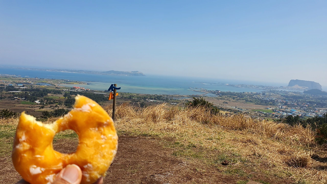 1시간 넘게 걸었더니 허기가 진다. 가방 속에 며칠 동안 들고 다녔던 껍질이 쭈글쭈글해진 한라봉 하나를 까서 입에 넣었는데 그 맛이 황홀하다. 아내가 준비한 도넛까지 먹으며 아름다운 제주 바다와 우도, 그리고 성찬 일출봉까지 보고 있으니 입맛에 감탄 한 번 눈 맛에 감탄 두 번 뭐 신선이 따로 없다. 그렇게 한참 동안 이 풍경을 바라보며 눈에 넣고 마음에도 넣는다.