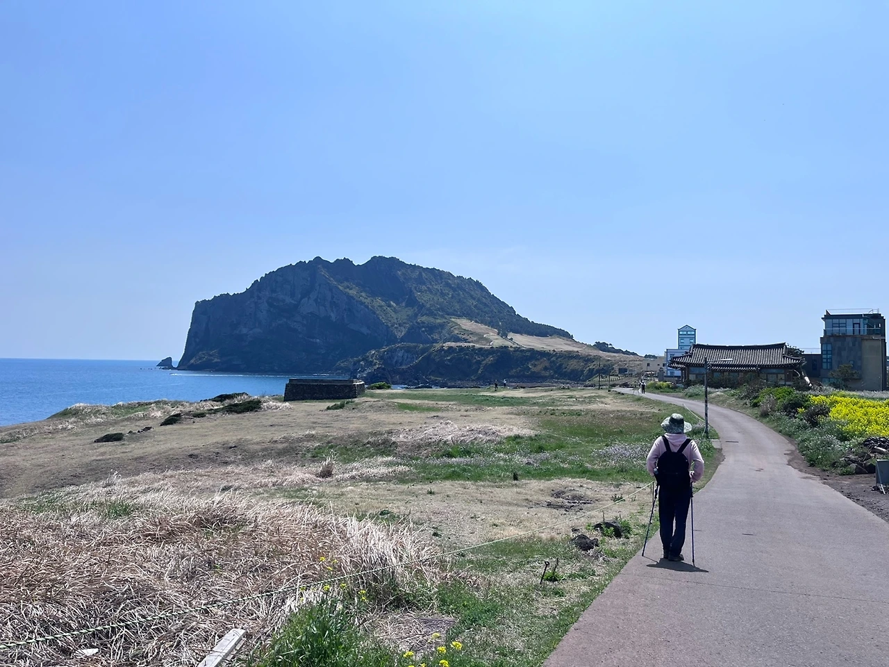 그런데 바로 내가 그렇게 좋아했던 풍경 앞에 리조트가 떡하니 들어서서 성산의 풍경을 가로막고 있다. '휴~' 한 숨이 절로 나온다. 그때 느꼈던 웅장함이 리조트 때문에 다 날아가버렸다. 혼자서 투덜투덜거리며 리조트 사잇길을 걷는다. 그래도 반가운 건 리조트 넘어 다시 만난 성산이다. 이곳의 풍경은 역시나 발걸음을 멈추고 넋을 잃고 성산과 바다를 마음껏 쳐다보게 한다.