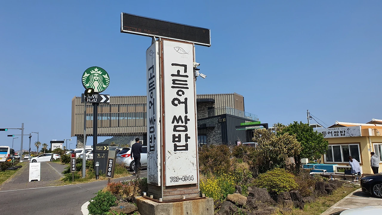 1코스 종착점 광치기 해변 올레 도장을 찍는 순간 속이 후련하다. 1코스를 완주했다는 뿌듯함이 밀려온다. 그것도 잠시 다리는 아프고 배가 너무 고프다. 광치기 해변을 나오니 여긴 대로변이다. 주변에 먹을 데가 없다. 저 멀리 별다방이 보이고 큰 가게들이 보이는데 다들 흑돼지 가게다. 이 시간(1시 30분)에 차로 가득한 집 하나가 눈에 띈다. '고등어 쌈밥'집이고 1박 2일 촬영 장소라고 한다. 썩 마음에 들지는 않는데 갈 곳이 없다. 허기와 지침을 해결하기 위해서 들어간 어쩔 수 없는 선택이었다.