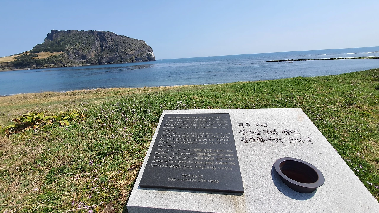 그런데 이 아름다운 이곳에 4.3 때의 말할 수 없는 슬픔이 있는지 처음 알았다. 4백여 명이나 되는 무고산 양민들이 학살된 곳이라고 하니 마음이 먹먹하다. 순간 아름답다고 생각한 풍경이 너무 슬프게 느껴진다. 1948년 9월 25일 (음력), 성산은 이때의 총성과 절규와 피를 생생하게 기억하고 있겠지. 그래서 이 슬픔을 지우려고 이곳 해안가 바위들이 더 초록빛을 띠는 건 아닐까 생각해 본다. 마음이 너무 먹먹해 뒤를 돌아보고 돌아보고 또 돌아보았다.