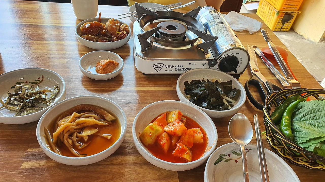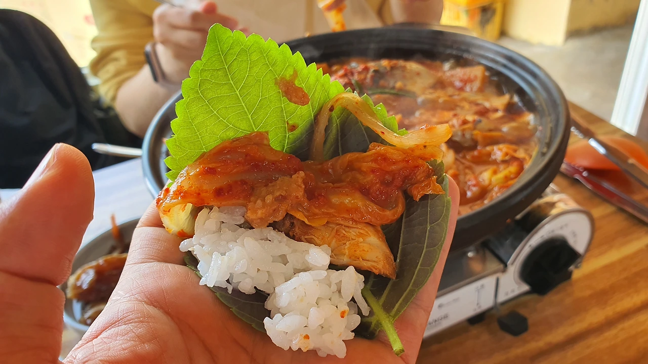 깻잎을 한 장 꺼내 고등어살 한 점과 묵은지 김치를 올려 쌈장과 함께 싸서 먹는데 역대급이다. 배가 너무 고파 맛있는지 원래 맛있는지 아무튼 1박 2일 간판 속 호동이가 열심히 먹고 있는 게 이해가 될 정도다. 그 많던 묵은지 김치는 순간 다 사라졌다. 그제야 사람들이 왜 김치를 추가 주문(5,000원 추가)하는지 이해가 되었다. 달짝하니 입에서 거의 녹는 수준이다.
