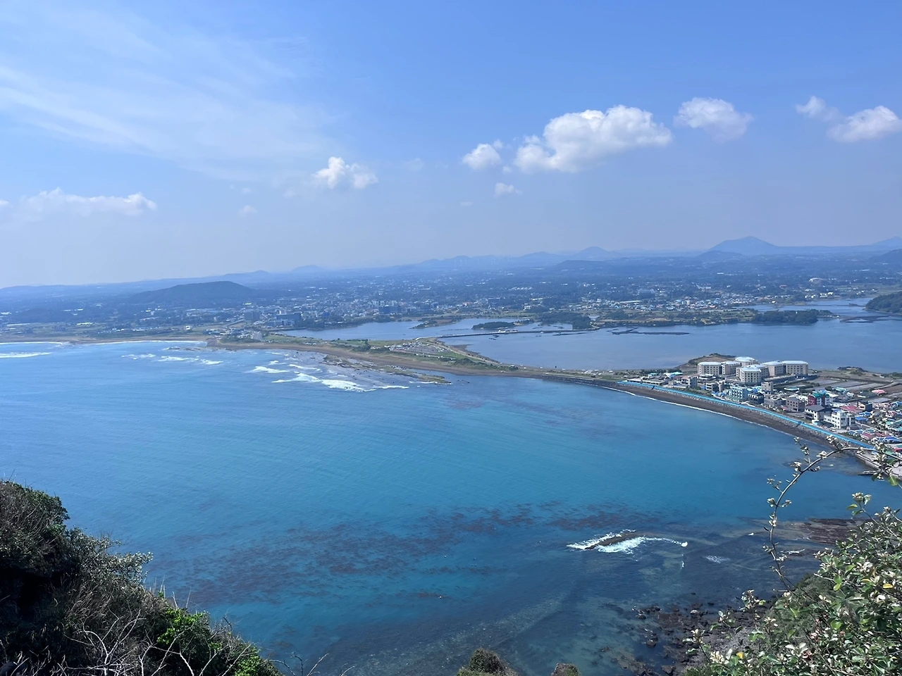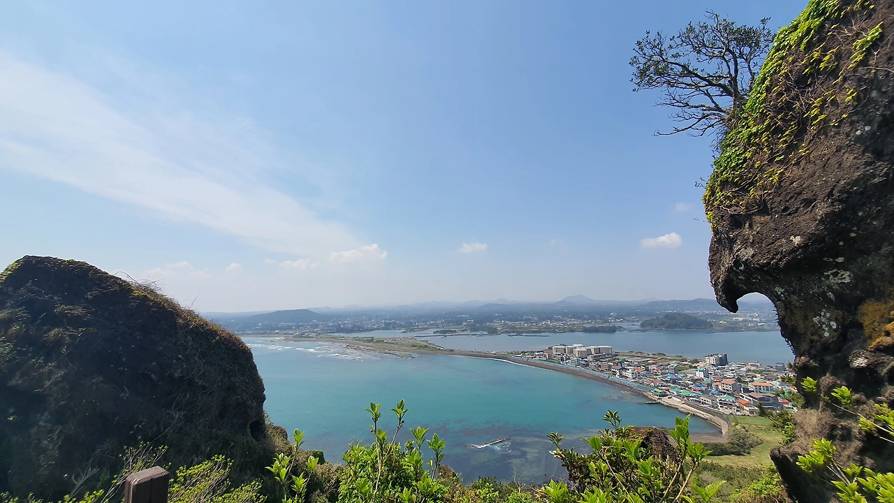 삼분의 이쯤 올라갔나 그렇게 힘들다던 사람들이 "우와! 우와" 거린다. 뒤를 돌아보니 성산 주위가 한눈에 쫙 그림처럼 펼쳐진다.